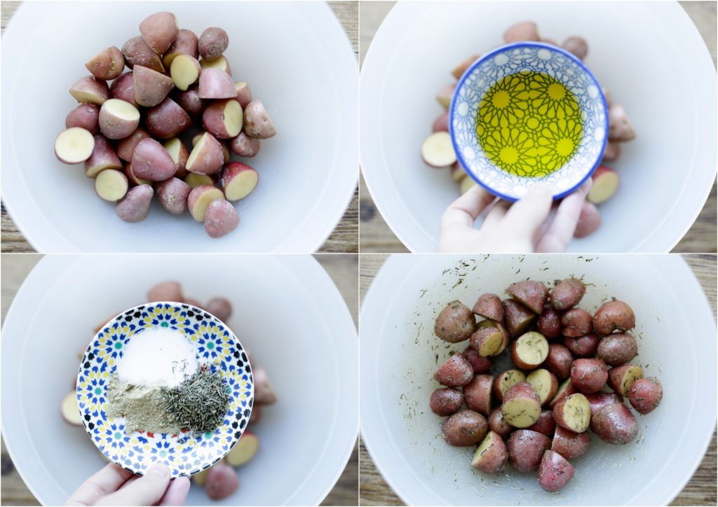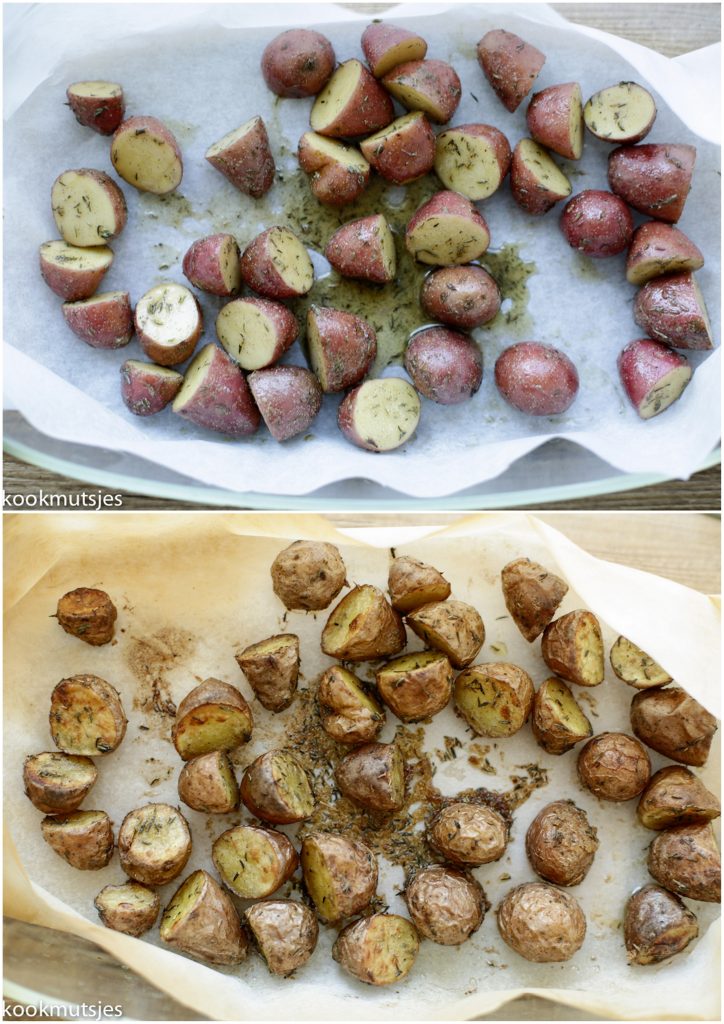 2 Doe de krieltjes in een bakpapier beklede ovenschaal. Verdeel de krieltjes over de schaal. Doe er aluminiumfolie omheen. Leg het in een voorverwarmde oven op 250 ℃ voor 30 tot 35 minuten. Wanneer de krieltjes gaar zijn, haal je de folie er vanaf. Leg de krieltjes weer terug in de oven voor zo’n 7 à 10 minuten of tot de krieltjes mooi goudbruin zijn gekleurd. |