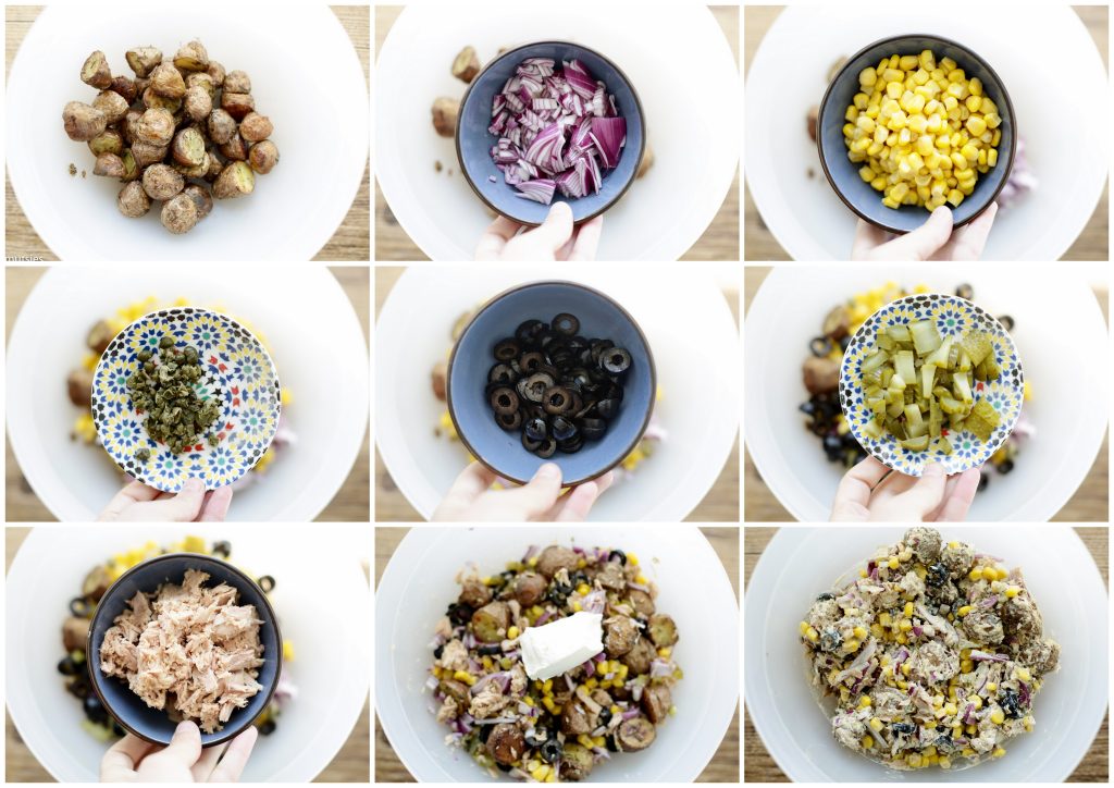 Salades zijn aangenaam om te zien en eenvoudig te maken. Met lekker veel groentes en romig door de roomkaas, is zo’n salade extra genieten. Het is een gewoon een heerlijke salade en door de geroosterde krieltjes uit de oven zijn ze nog lekkerder!