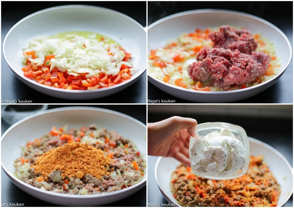 3 Verhit de olijfolie in een steelpan en voeg de groentes toe. Bak 5 minuten. Voeg het gehakt toe en bak 7 minuten. Als het gehakt gaar is, voeg je de lasagne kruiden en crème fraîche toe. Bak 5 minuten. Indien nodig, voeg zout toe naar smaak. Ik heb 1 tl zout toegevoegd. Haal van het vuur en leg het apart. |
