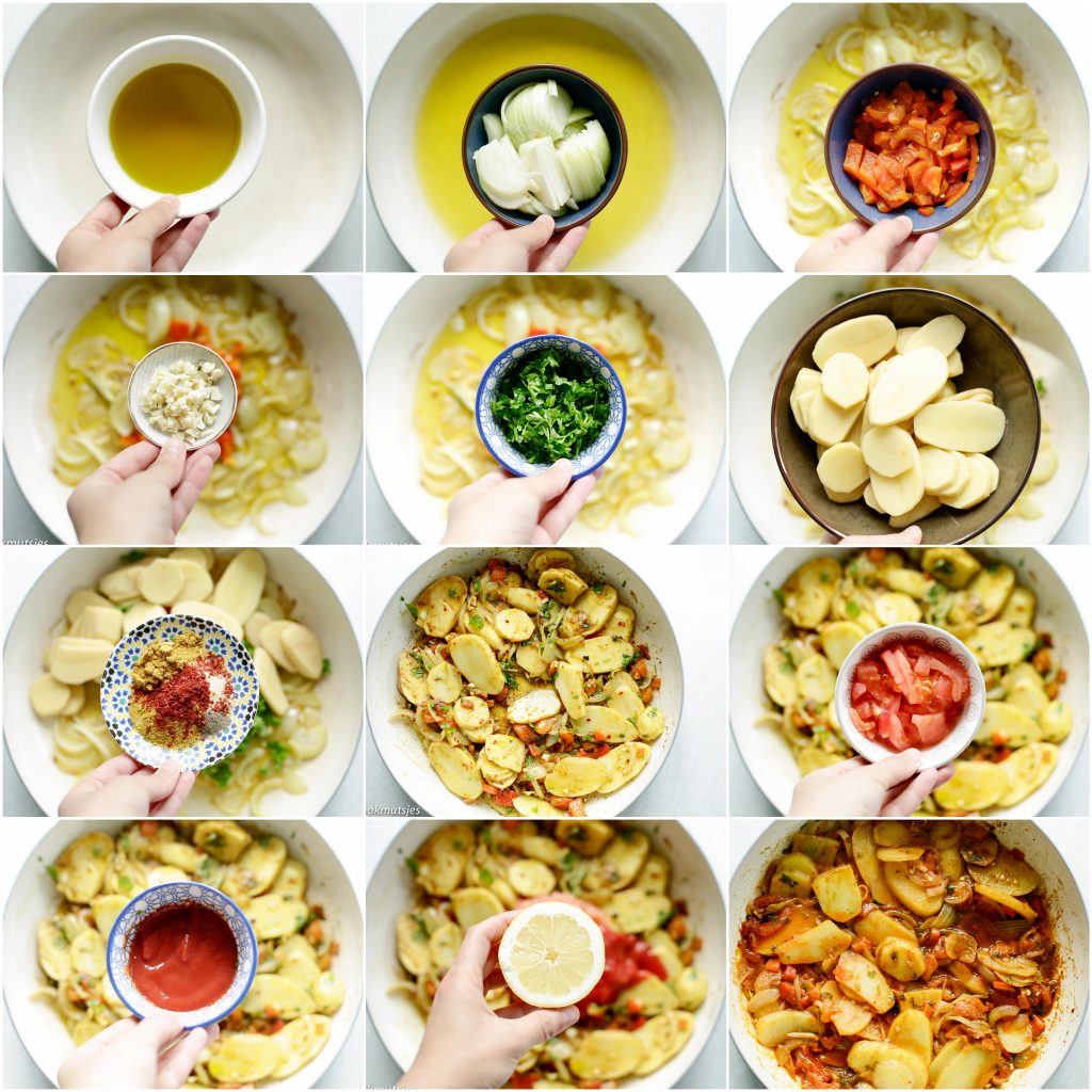 3 Verhit de olijfolie in een pan en voeg de ui toe. Bak de ui voor zo’n 5 minuten of tot de ui goudbruin is gekleurd. Voeg de paprika, knoflook, koriander, aardappelschijfjes, viskruiden, zwarte peper, zoete paprikapoeder, knoflookpoeder, ras el hanout en zout toe en bak alles samen voor zo’n 2 minuten. Voeg de tomaat, gezeefde tomatensaus en citroensap toe en zet het vuur hoog. Wanneer het begint te sudderen, zet je het vuur op z’n laagst. Leg er een deksel op en kook het samen voor zo’n 12 minuten. |