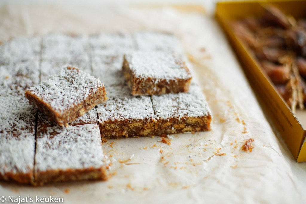 Hi Berkania, Als je veel dadels hebt dan zou ik het velletje eraf halen en dan zou ik het mixen met de ongeklopte slagroom en gesmolten boter. Samen op de kook zetten en dan de kokos en koekjes toevoegen 🙂