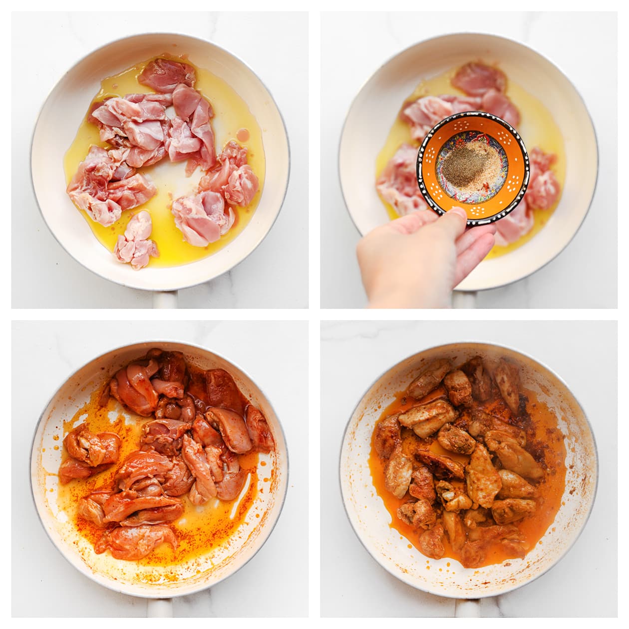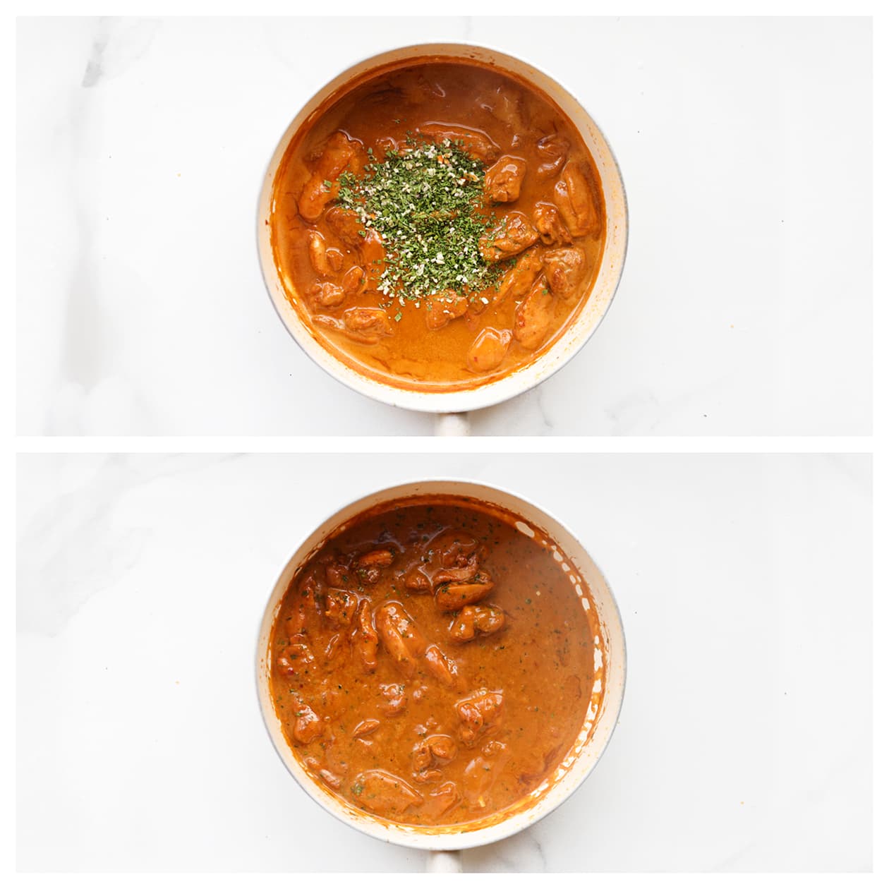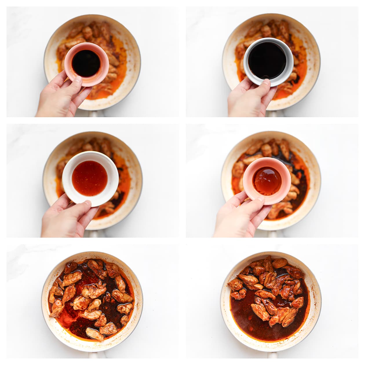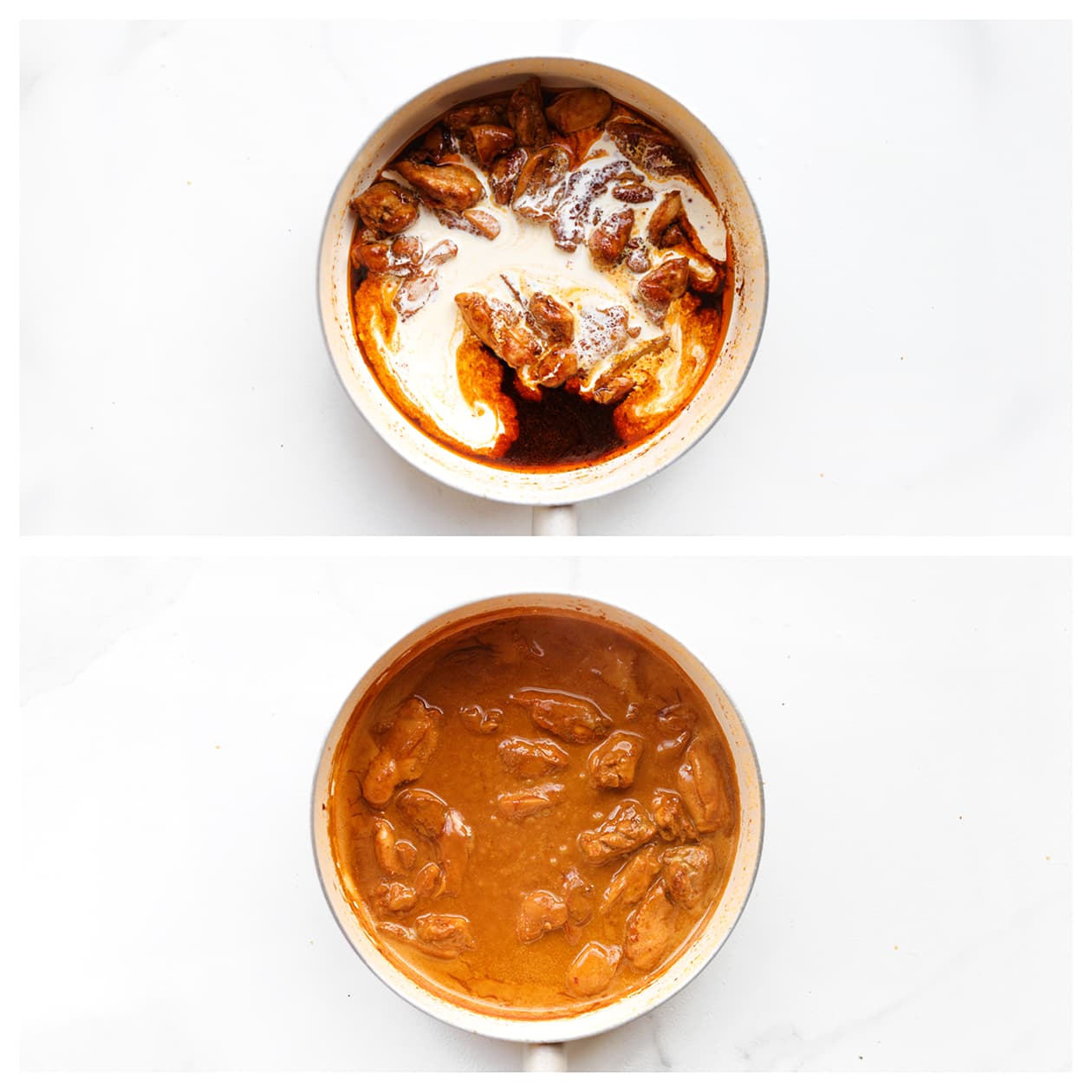 Laat de kip echt goed bakken vóór je de sauzen toevoegt. Dat geeft meer smaak en voorkomt een waterige saus.