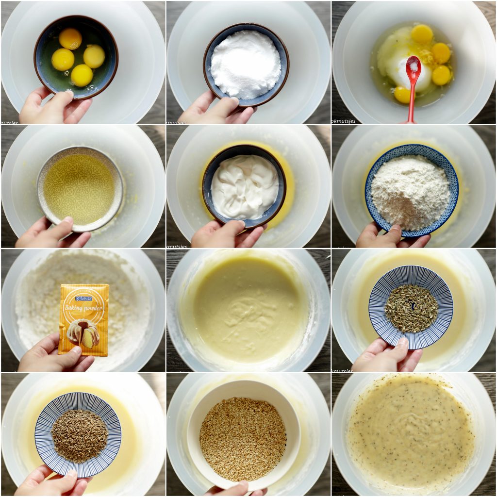 1 Doe de eieren, zout vanillesuiker en suiker in een diepe kom en mix het samen voor zo’n 2 minuten. Voeg de zonnebloemolie en Griekse yoghurt toe, mix het samen. Voeg de bloem en bakpoeder toe, mix het weer samen tot een geheel. Voeg de anijszaad, venkelzaad en sesamzaad toe, mix alle ingrediënten samen. |