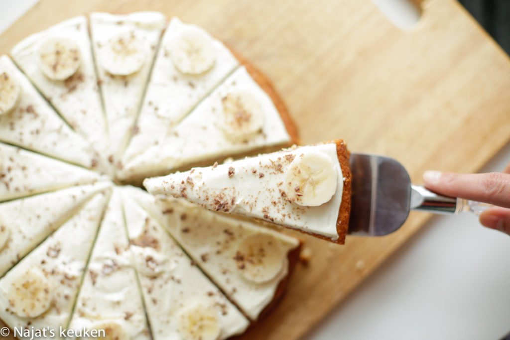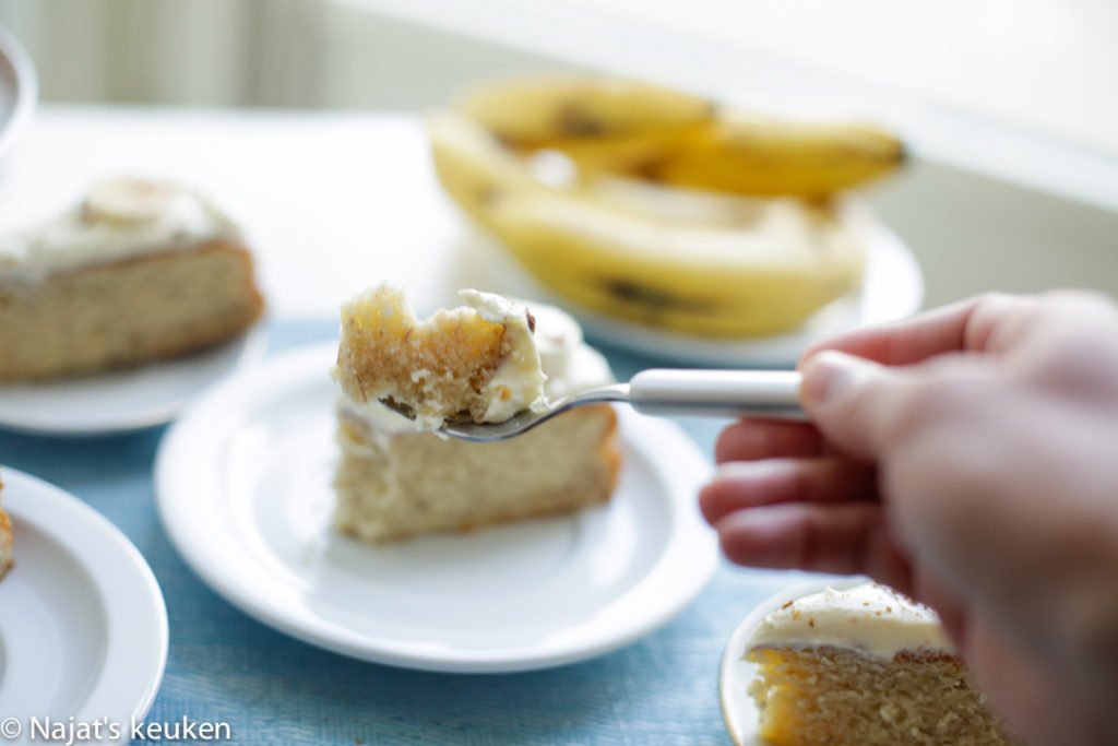 Rijpe bananen in huis? Maak dan optimaal gebruik hiervan en maak nu deze heerlijke, smeuïge bananen cake. Altijd als ik aan een bananen cake denk moet ik automatisch denken aan mijn tante in Marokko, zij maakte altijd de lekkerste bananen cake! Wanneer we een bezoekje brachten had ze dit altijd op tafel staan samen met een heerlijke kopje muntthee, wat was dat smullen zeg! Zij maakte het altijd zonder topping en de smaak was toen al fenomenaal. Ik heb ervoor gekozen om het te verrijken met een roomkaas topping, vind het altijd wel leuk om de cake te versieren en het maakt het ook nog eens een stuk smeuïger. De cake is zacht met de perfecte hoeveelheid bananensmaak, verrukkelijk en perfect voor elk gelegenheid.