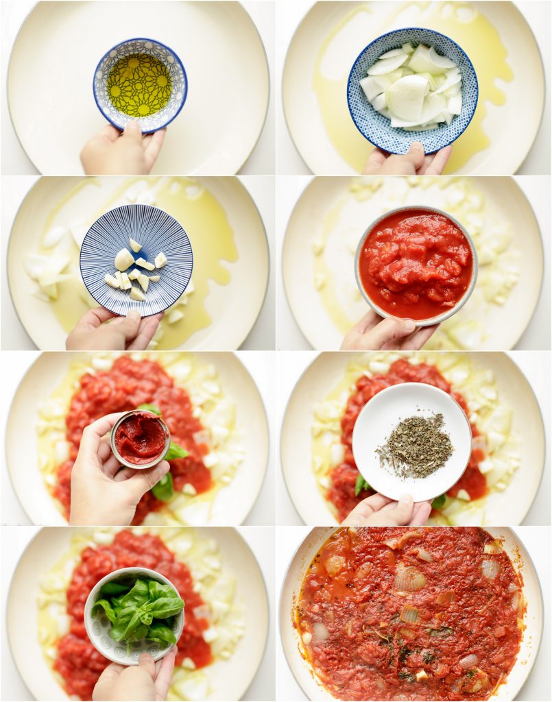 1 Verhit wat olijfolie in een steelpan. Voeg de ui en knoflook toe en bak het zo’n 4 minuten samen. Voeg de tomatenblokjes, tomatenpuree, basilucm en oregano toe. Kook dit samen op hoog vuur. Als het begint te sudderen, zet je het vuur op z’n laagst en laat je het zo’n 20/30 minuten koken. Zet het vuur uit en laat het iets afkoelen. |