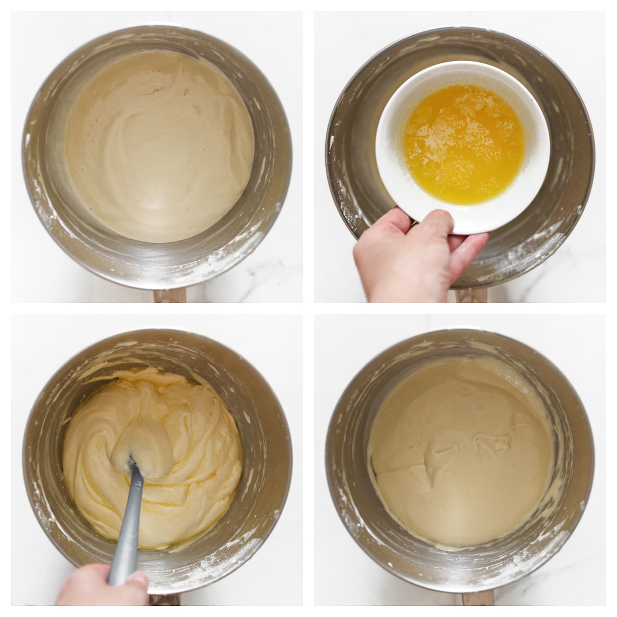 Voeg de gesmolten boter pas op het einde toe en zorg dat deze is afgekoeld tot lauwwarm, zodat het beslag niet inzakt.
