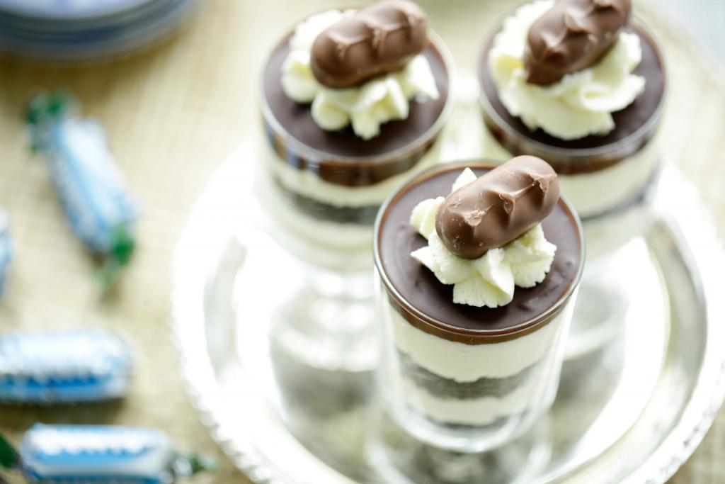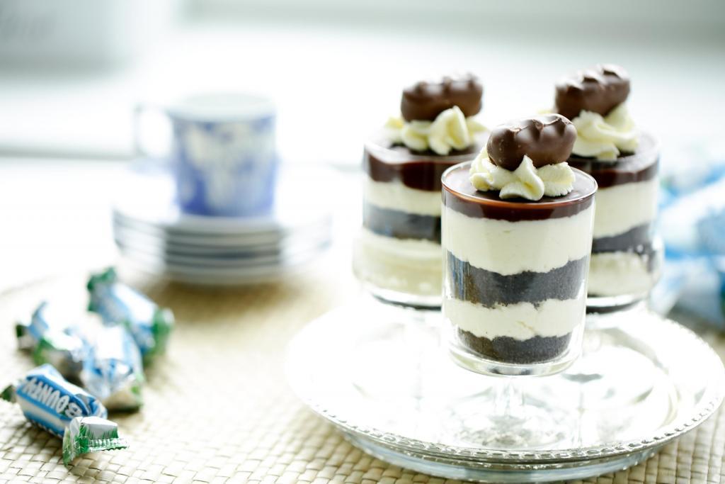 Deze toetjes zijn echt een triple threat, so good! Chocolade en kokos werkt voor mij altijd wel en is misschien wel één van de beste smaakmakers. Ze hebben allen een laagje Oreo crumbs en een flinke laag kokosroom (tweemaal), worden bedekt met een romig laagje van ganache en afgemaakt met een snoezig toefje room! Zo smaakvol als het is, komt er ook nog eens een mini Bounty op.