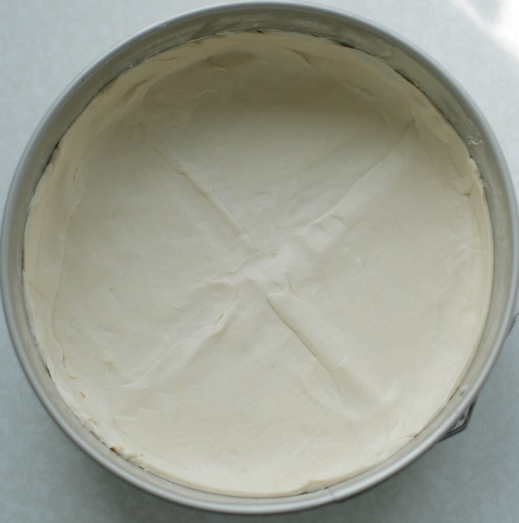 4 Verdeel de amandelspijs gelijkmatig over het bladerdeeg (gebruik de onderkant van een lepel als hulpmiddel). Giet het cakebeslag over de amandelspijs. Leg de cake in een voorverwarmde oven op 160℃ voor zo’n 25-30 minuten. Wanneer je met een satéstokje in de cake prikt en er droog uitkomt, is de cake klaar. |