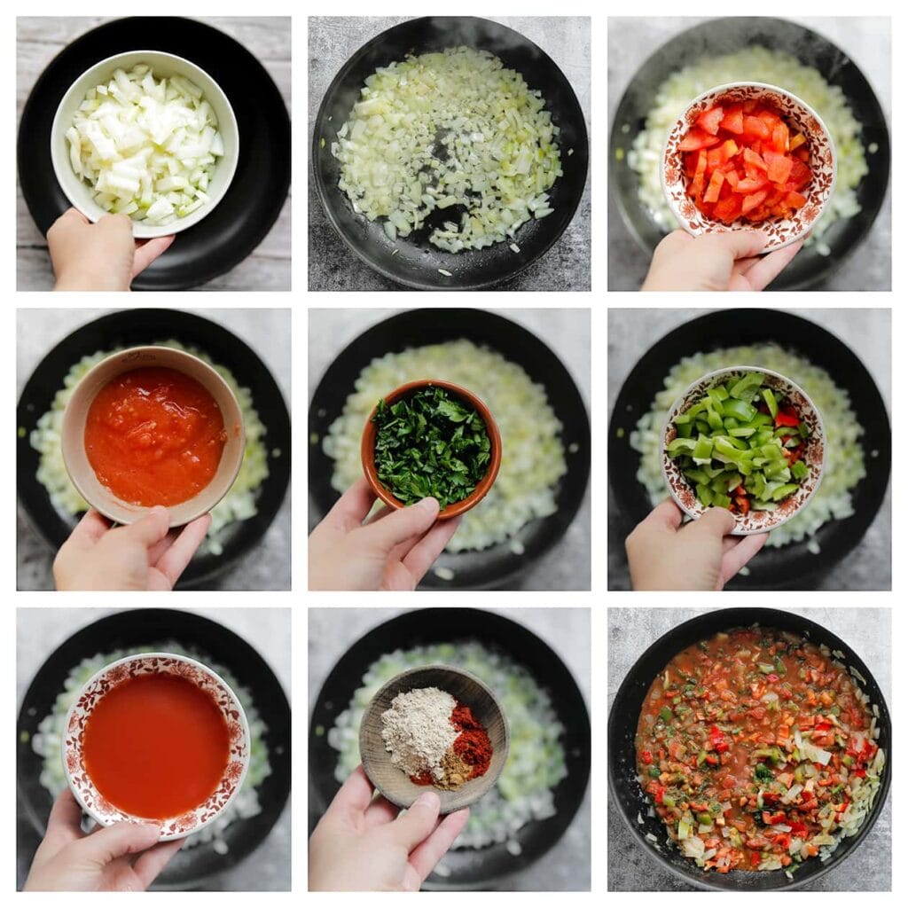 6 Verhit de olijfolie in een koekenpan op middelhoog vuur. Voeg de gesnipperde gele ui toe en bak 4-5 minuten. Voeg de rode puntpaprika, groene paprika, fijngemalen tomatenpuree, gehakte peterselie, het water, de tomatenpuree, knoflookpoeder, paprikapoeder, komijnpoeder en cayennepeper toe. Meng goed. |