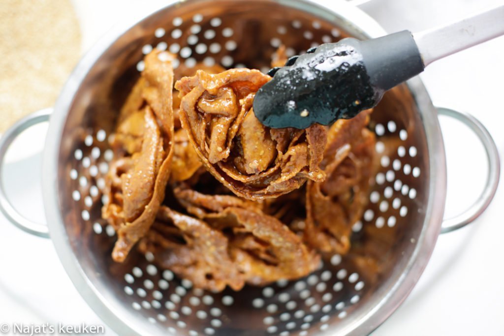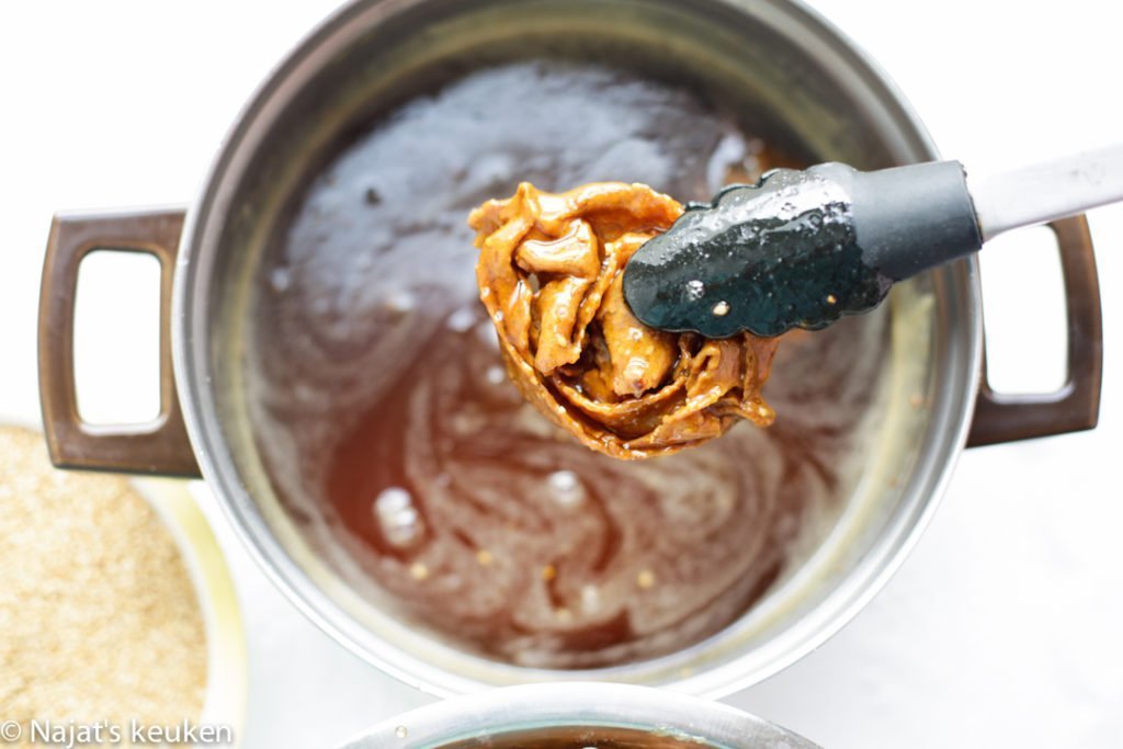 Hoe langer je de chebakia in de honing dompelt, hoe zachter die wordt. Pas dit aan op eigen voorkeur.