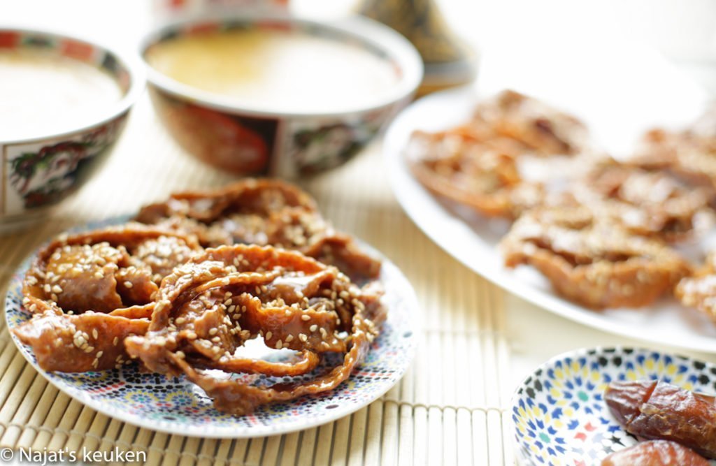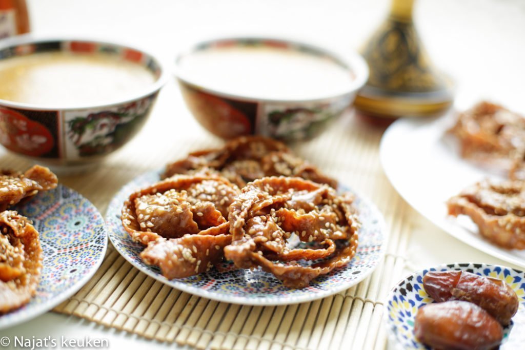 Chebakia is een traditioneel populair zoet honingkoekje. Tijdens het verbreken van het vasten wordt dit naast de bekende Harira als bijgerecht opgediend. Dit is echt op bijna ieder Marokkaanse eettafel te vinden tijdens de heilige maand Ramadan. Alleen als ik er aan denk, verlang ik weer naar de gezellige en mooie momenten.