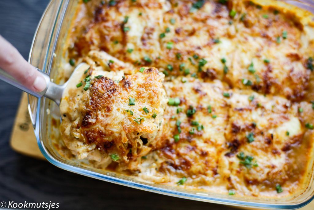 Deze aardappelschotel is heerlijk wanneer het warm uit de oven komt, maar ik raad je aan om het eerst even af te laten koelen. Hierdoor krijg je er ook hele mooie stukken uit, alleen geduld is hier wel bij nodig! Serveer hier nog een frisse salade bij en je bent helemaal klaar!
