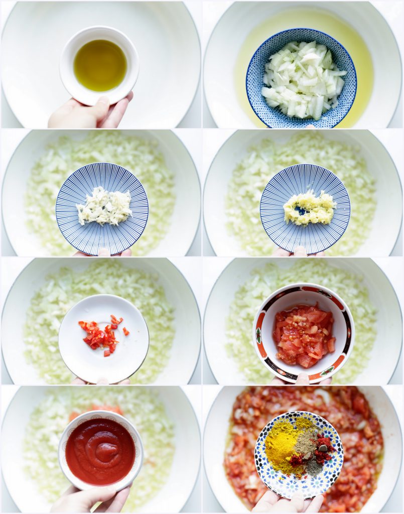 3 Snijd de ui, peper en rasp de knoflook en gember. Ontvel de tomaat en snijd het in blokjes. |