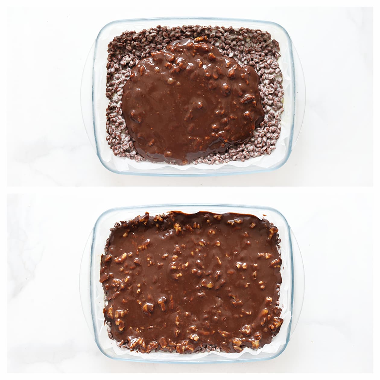 Druk de eerste laag stevig aan met de achterkant van een lepel of een spatel. Hoe compacter, hoe mooier de stukjes later snijden.