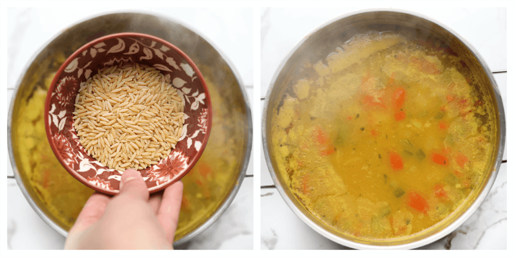Voeg de orzo toe aan het soepje wanneer het bijna gaar is.