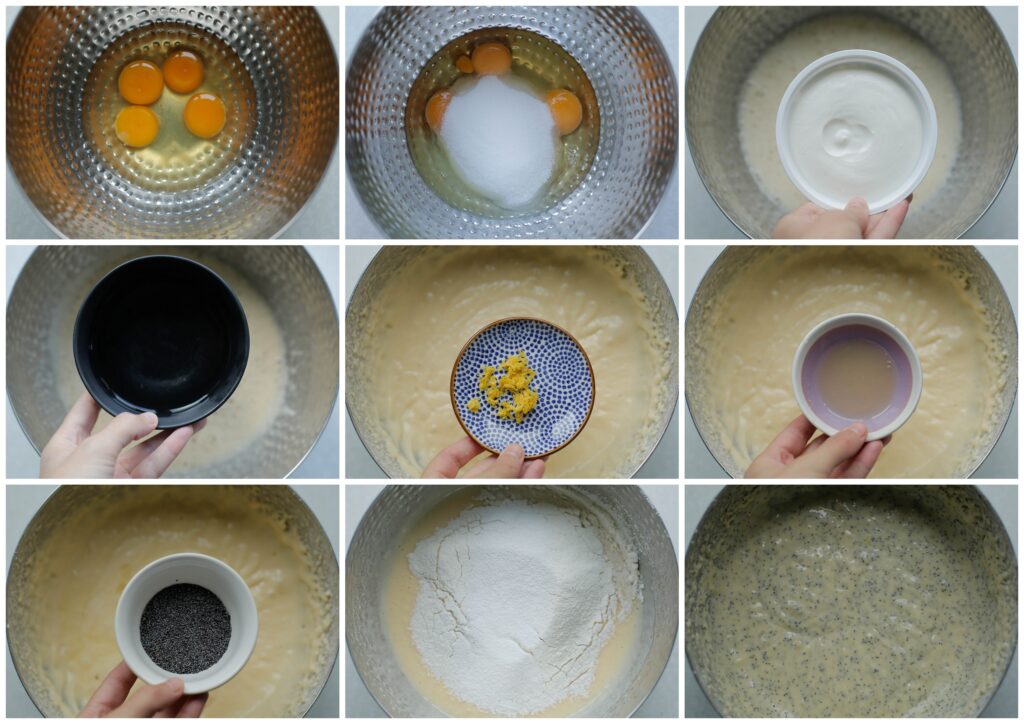 2 Breek de eieren boven een kom. Klop de eieren samen met de suiker en zout op voor een minuut. Voeg de zonnebloemolie en ricotta toe. Klop met een garde tot een geheel. Voeg de citroenrasp, citroensap en maanzaad toe. Meng goed. Zeef de bloem en bakpoeder boven de kom. Mix alle ingrediënten samen tot een gladde massa. |