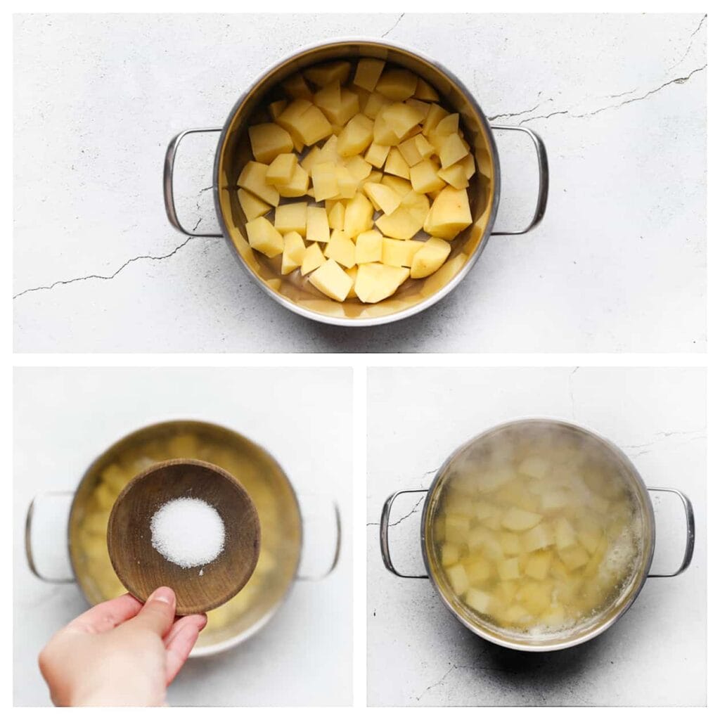Schil en snijd de aardappels in stukken. Breng een pan met water aan de kook, voeg de aardappels (optioneel: beetje zout) toe en kook ze in ca. 15 minuten gaar. Giet af.