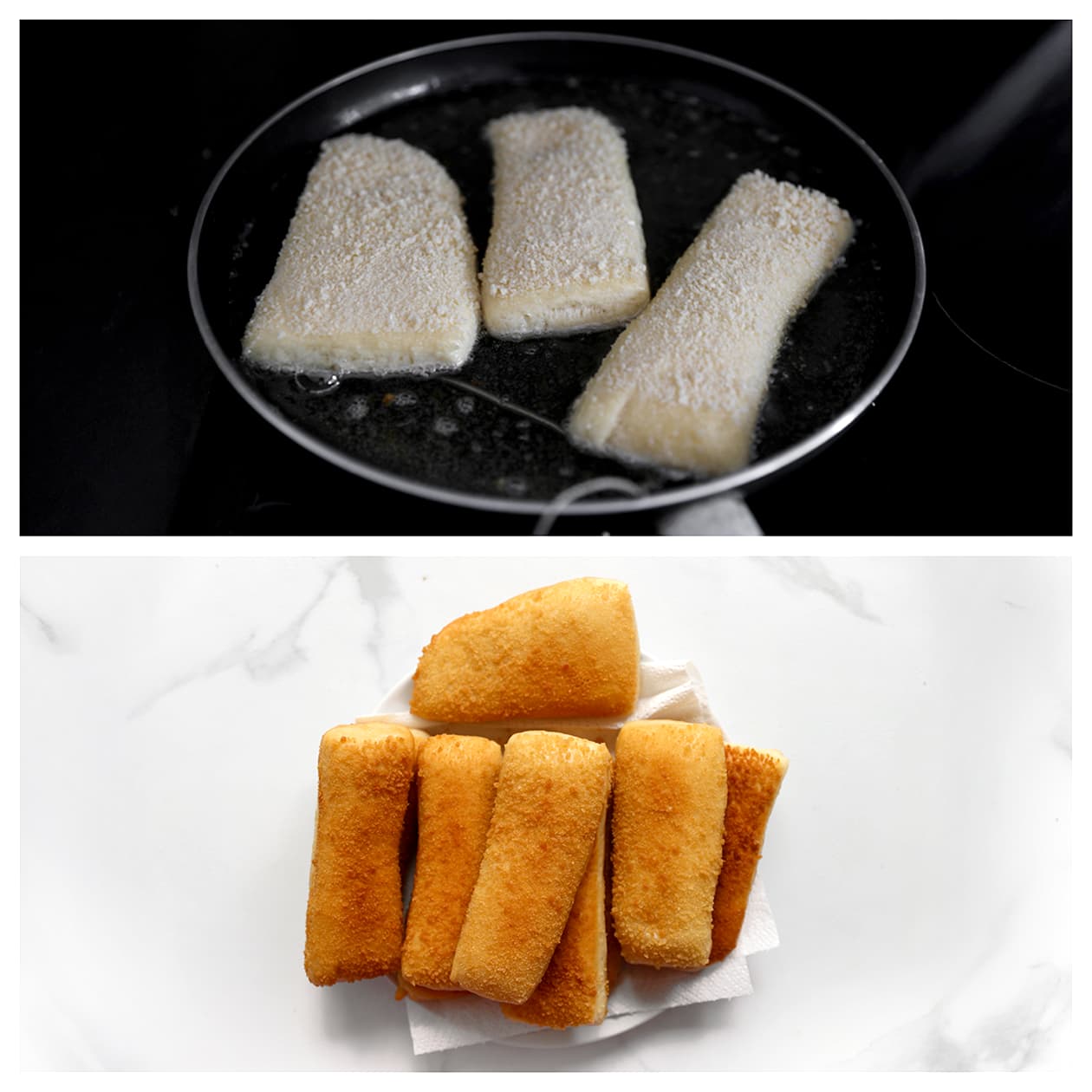 Verhit een koekenpan met een laagje zonnebloemolie tot 175 °C. Bak de broodjes aan beide kanten goudbruin. Laat uitlekken op keukenpapier.
