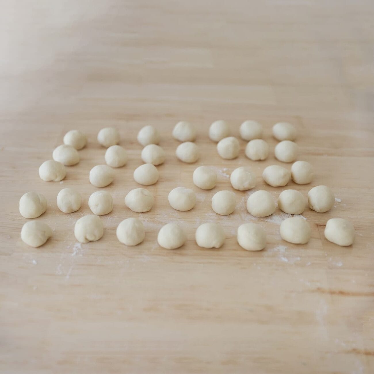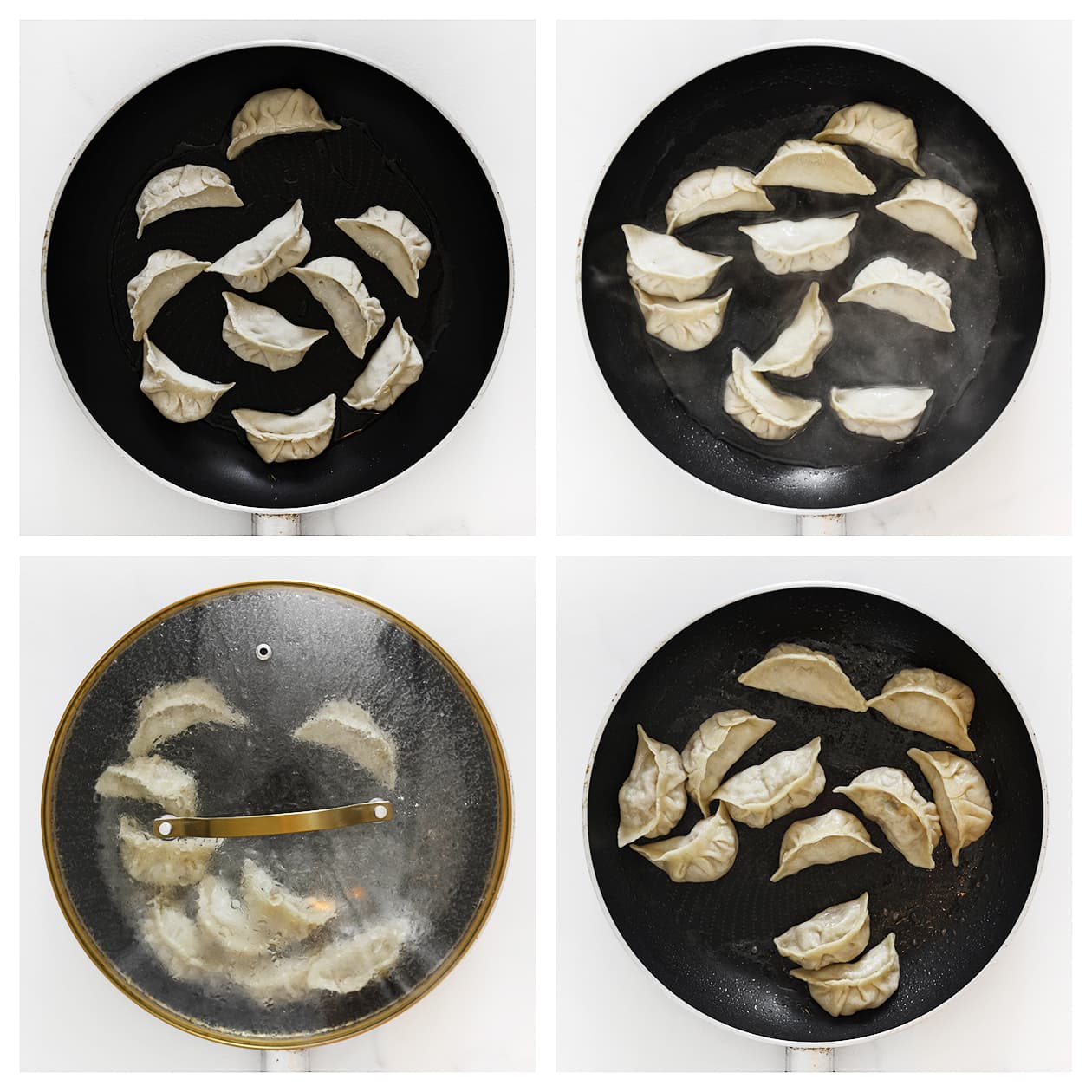 Laat een beetje ruimte tussen de dumplings in de pan, zodat ze niet aan elkaar plakken tijdens het bakken.