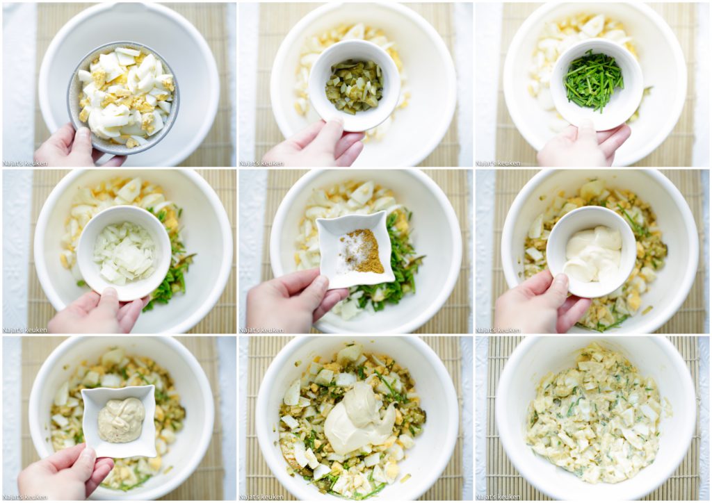 1 Kook de eieren hard voor zo’n 11 tot 13 minuten. Koel de eieren af door het onder de koude kraan te houden. Pel de eieren en snijd ze klein. |