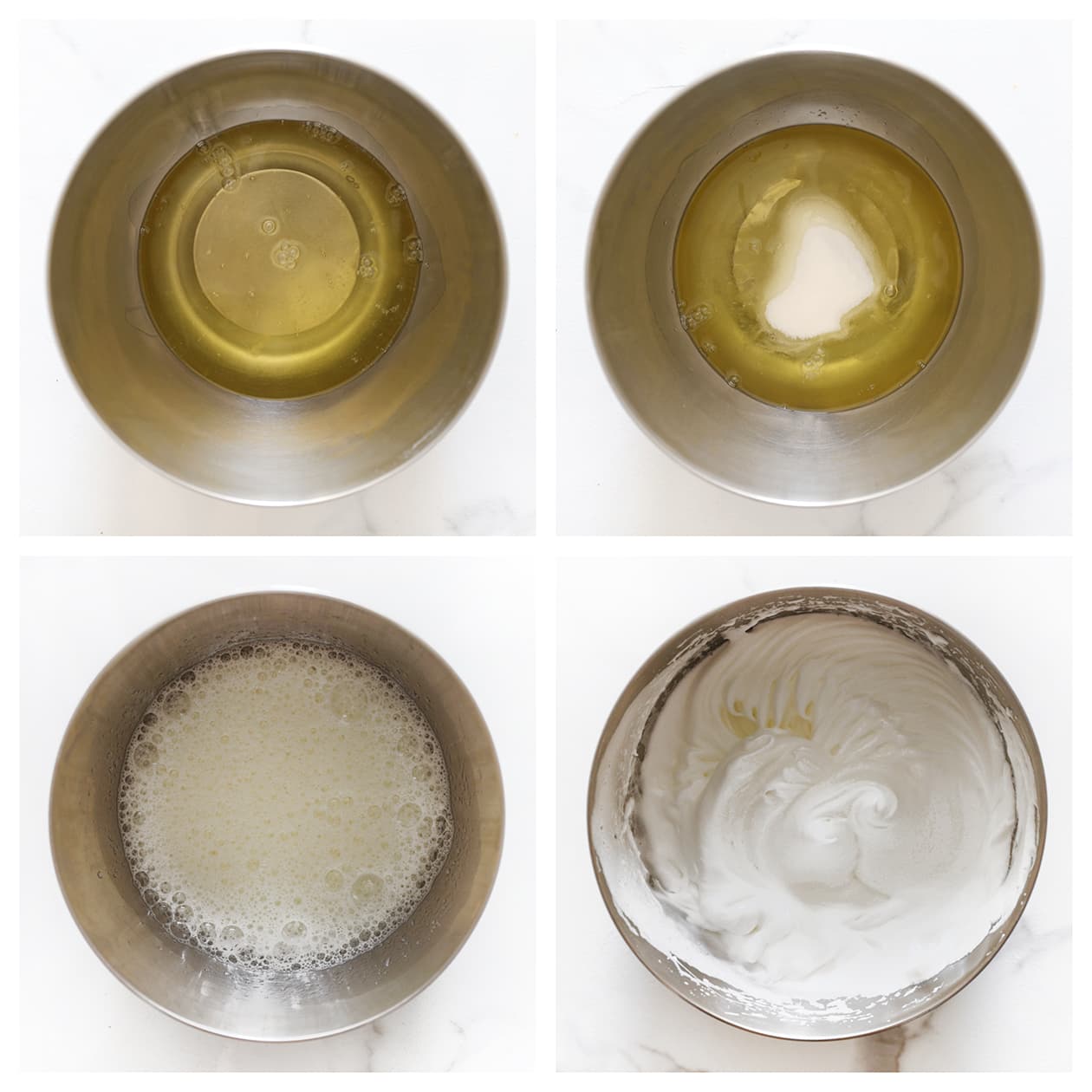 De eiwitten zijn perfect wanneer het mengsel glanst en stevige pieken vormt die rechtop blijven staan wanneer je de garde optilt.