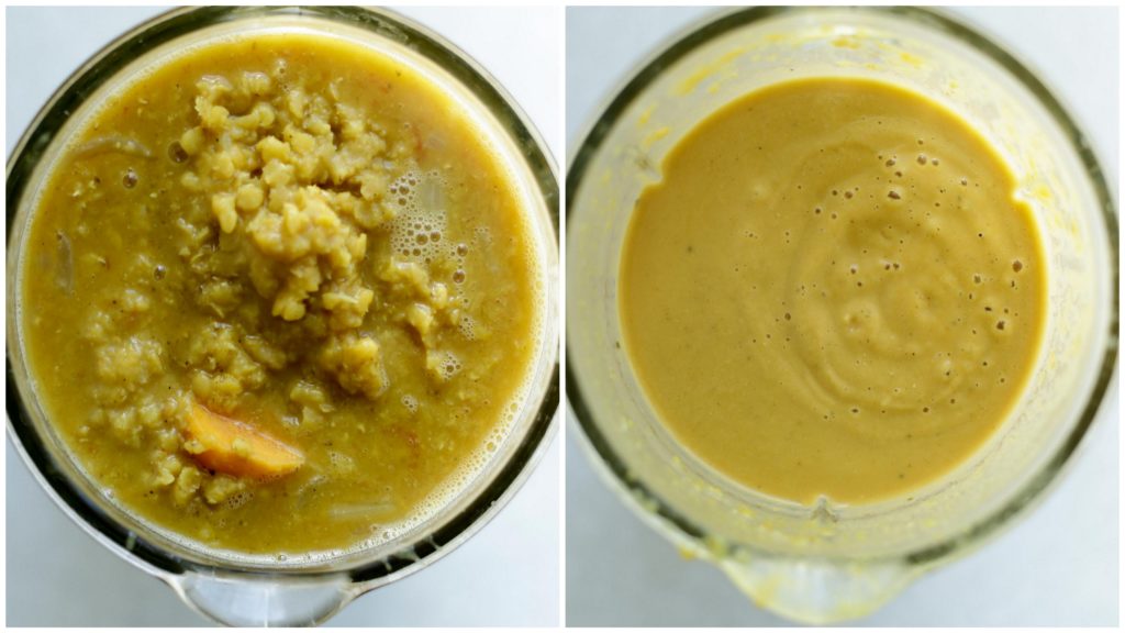 Haal de laurierblaadjes uit de pan en doe de gekookte groentes in een blender (of gebruik een staafmixer). Blend alles samen tot een gladde massa.