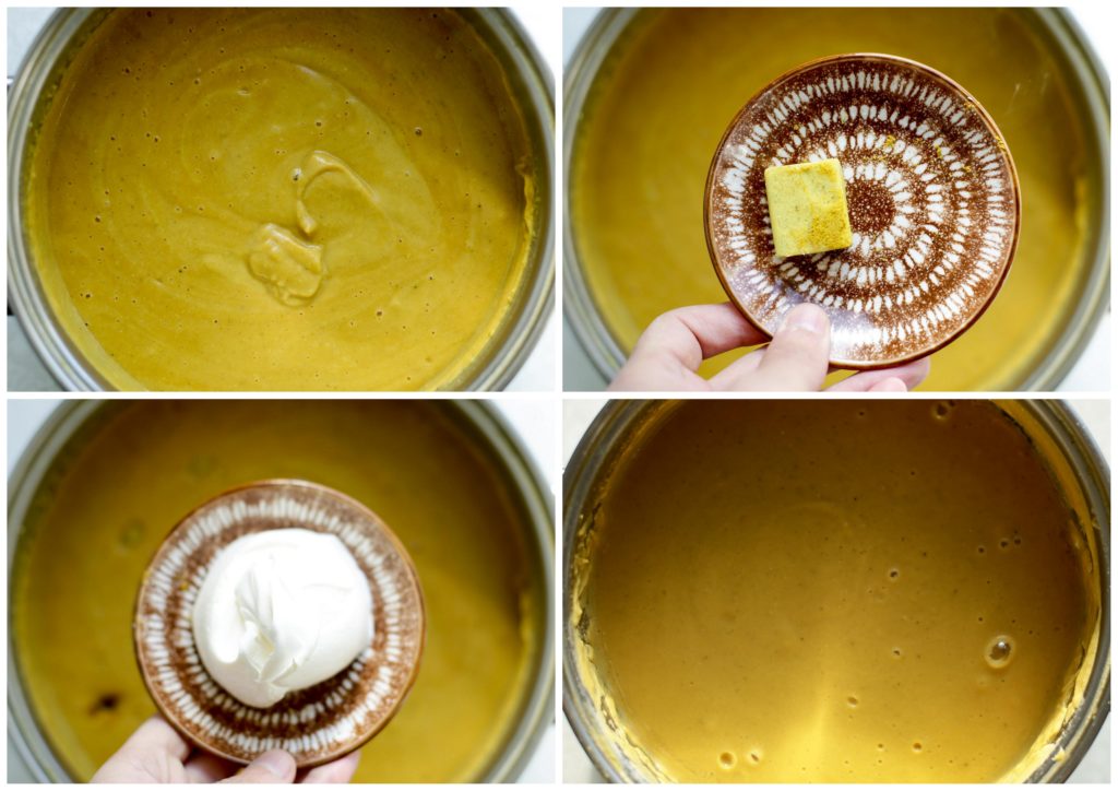 Doe het weer terug in de pan. Voeg de kippenbouillon en crème fraîche toe (klop/mix het samen). Kook het verder voor zo’n 5 minuten.