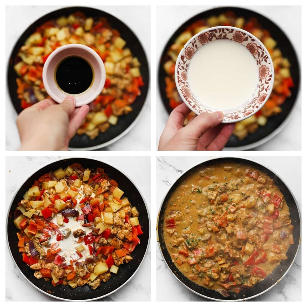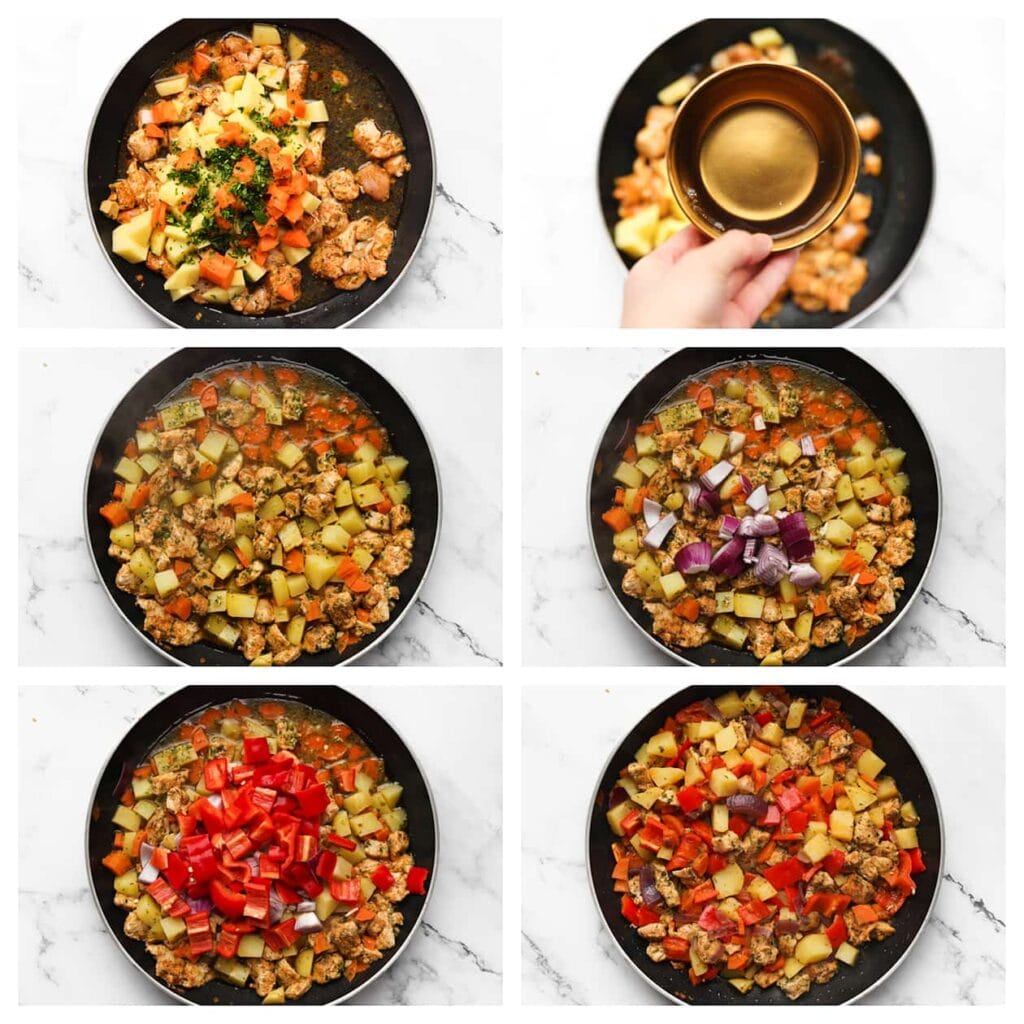 Zorg ervoor dat de aardappels en wortels beetgaar zijn voordat je de rode ui en paprika toevoegt.