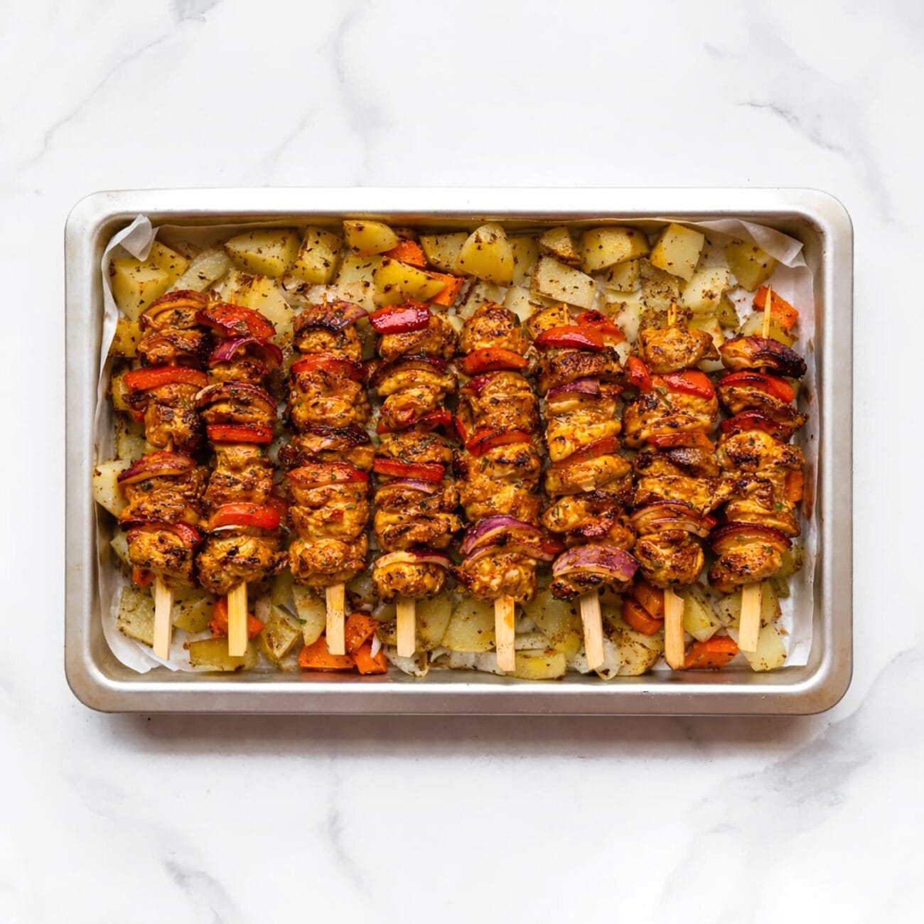 Deze kipspiesjes met aardappels uit de oven zijn perfect voor wie houdt van makkelijke, smaakvolle maaltijden. Alles wordt samen gegaard in één ovenschaal, waardoor je weinig afwas hebt en maximaal geniet. Ideaal voor doordeweeks!