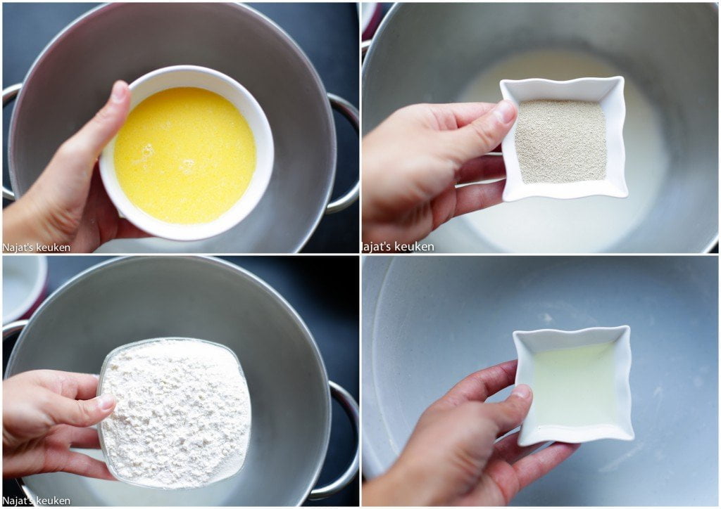 3 Voeg de gesmolten margarine, melk en gist toe, mix tot een geheel. Voeg een beetje bij beetje bloem toe en kneed alles zo’n 12 minuten tot een geheel. Het deeg is vrij plakkerig, daarom voeg je op het eind 15 ml zonnebloemolie toe. Dek het af en laat het deeg een uur rijzen op een warme plek of tot het in omvang is verdubbeld. |