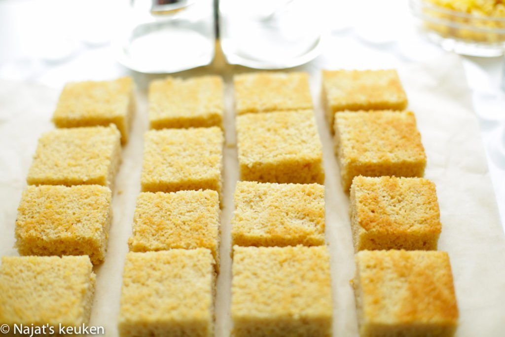 – Snijd de zijkanten van de cake om er mooie, gelijke stukken uit