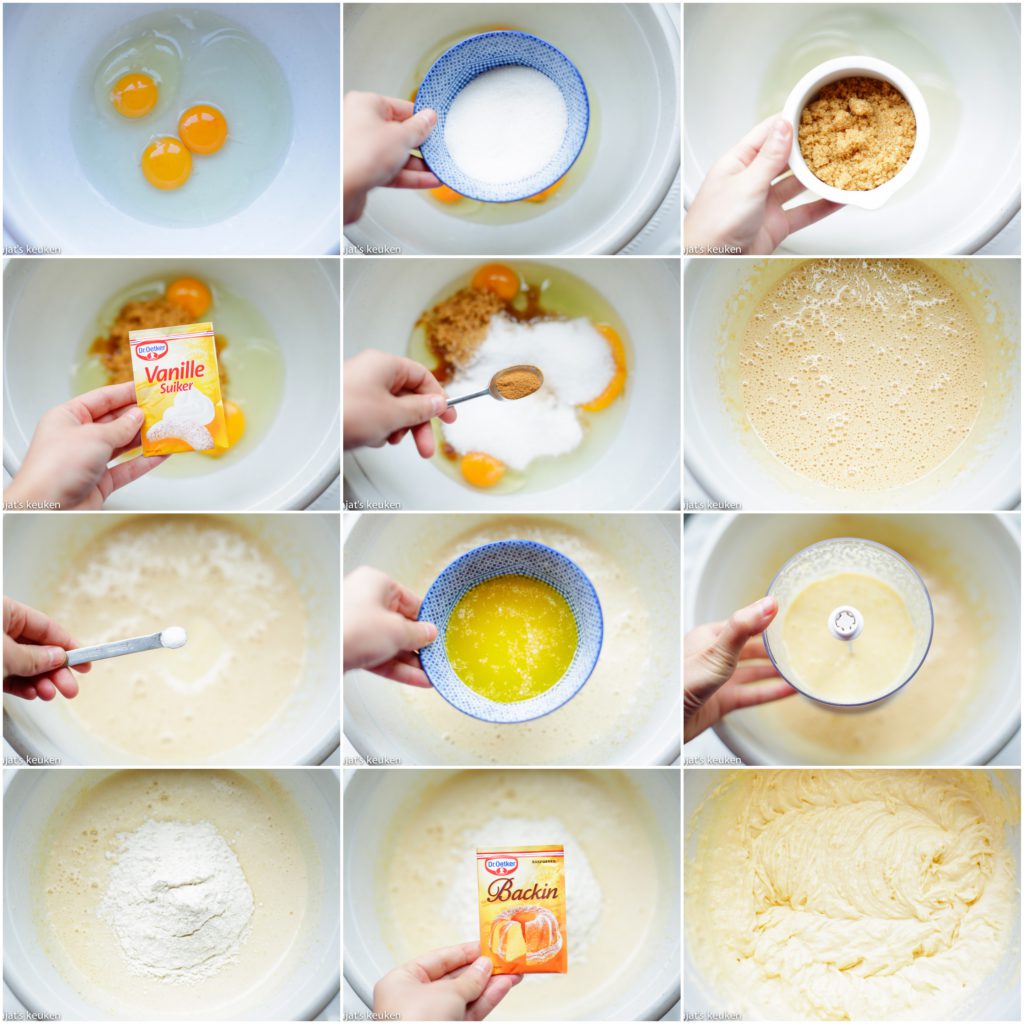 3 Mix de eieren samen met de suiker, bruine basterdsuiker, vanillesuiker, zout en kaneel voor een paar minuten op hoge snelheid. Het moet een schuimig effect krijgen met een lichtgele kleur. Voeg de maïsmengsel en gesmolten roomboter toe, mix goed samen. Voeg de bloem en bakpoeder toe en mix samen tot een geheel. |