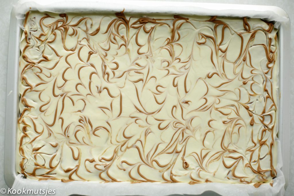 7 Giet de witte chocolade erop en laat het weer volledig en gelijkmatig uitvloeien. Spuit er direct lijntjes op van speculoos (maak gebruik van een spuitzak en maak er een kleine knip in). Gebruik een satéprikker om de lijnen sierlijk te maken. Wees niet bang, maak simpel wat ronde bewegingen die alle kanten op gaan. Het komt er echt heel mooi uit te zien! |