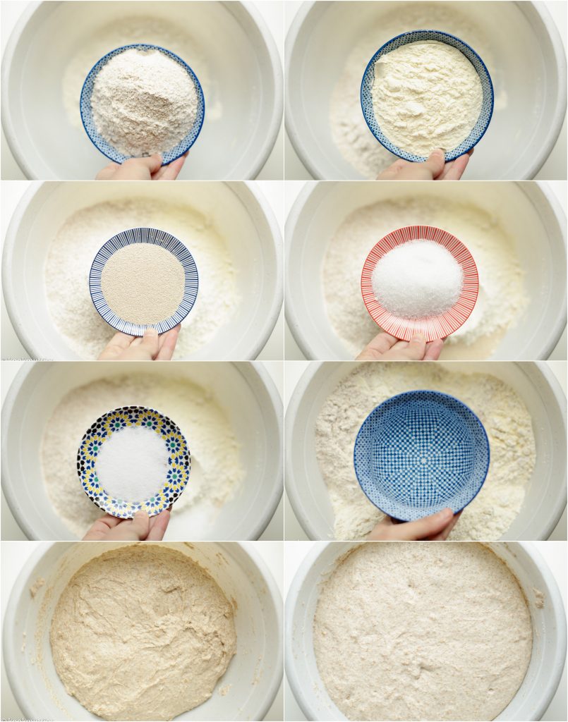 1 Doe de volkoren tarwemeel, patentbloem, fijngemalen griesmeel, gist, suiker en zout in een diepe kom en voeg steeds een beetje bij beetje het warme water toe. Kneed zo'n 10 minuten samen. Het deeg voelt plakkerig aan. Dat is het resultaat wat je moet hebben. Dek het af en laat het 45 tot 60 minuten rijzen. |