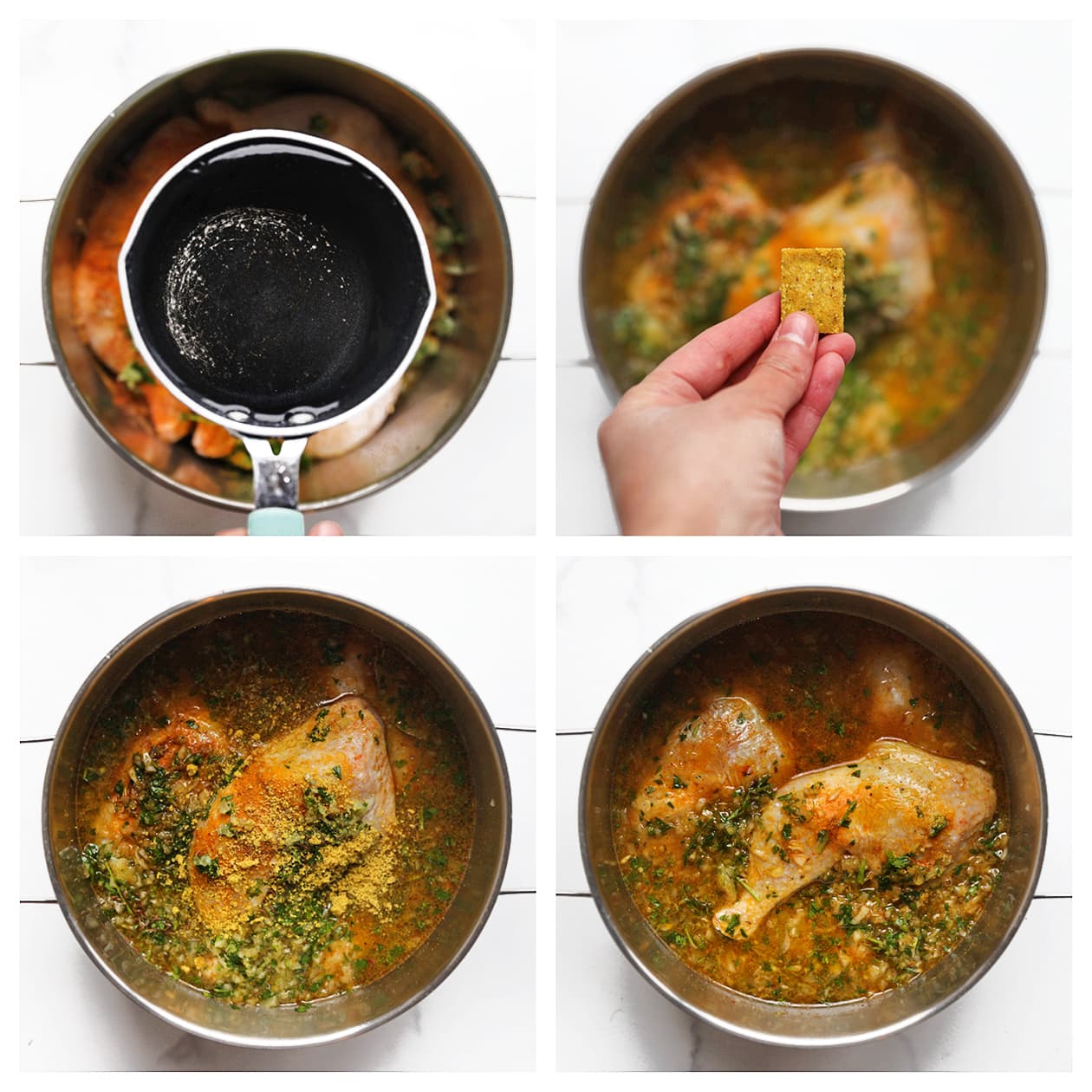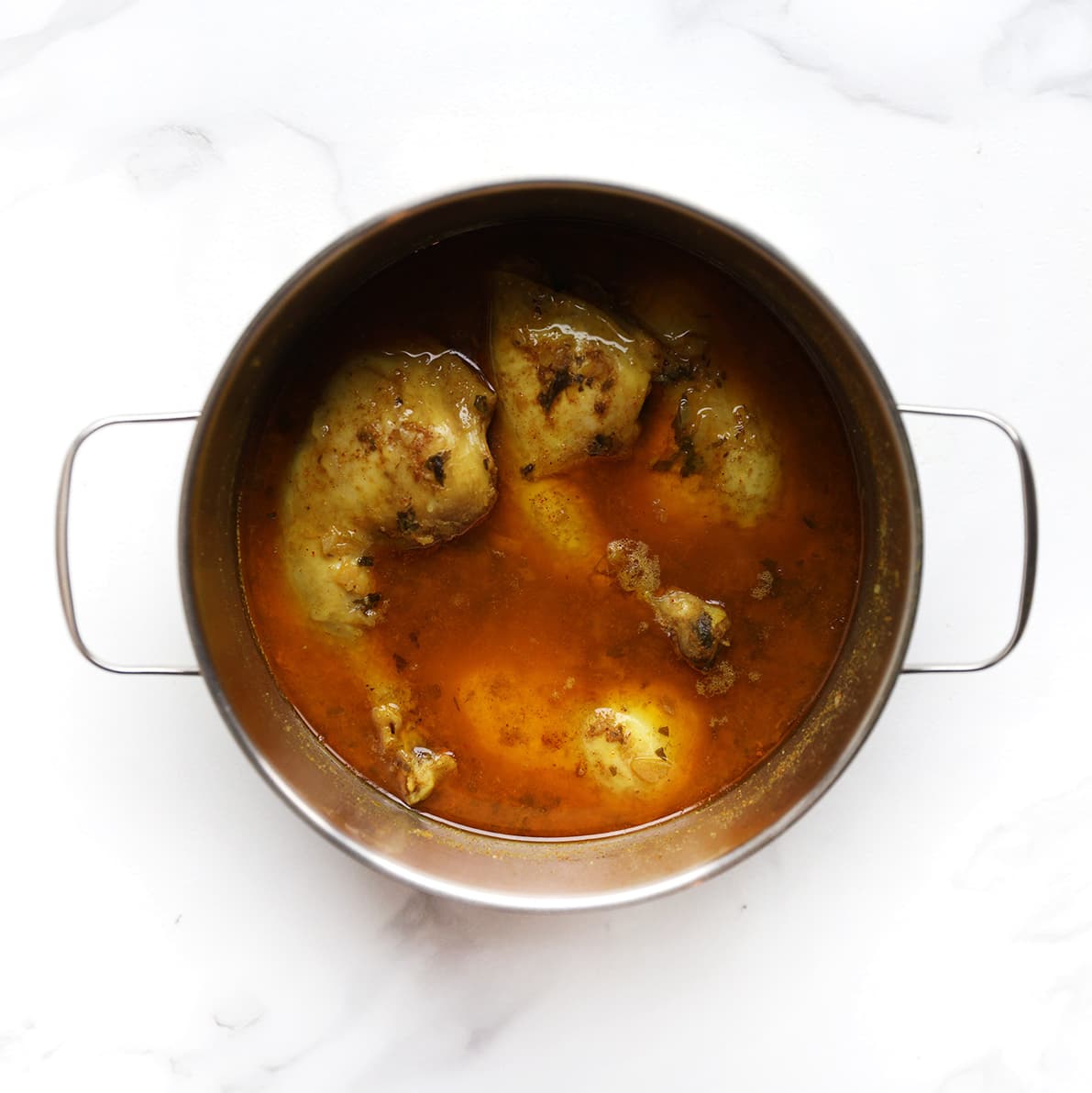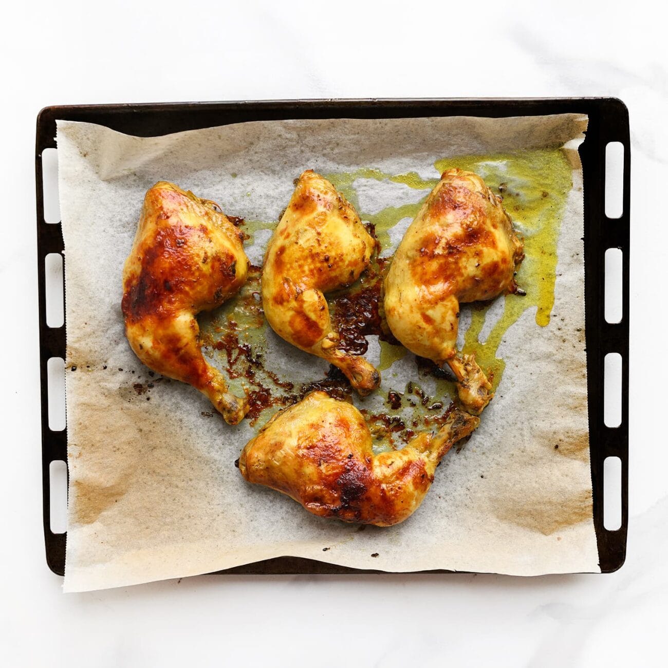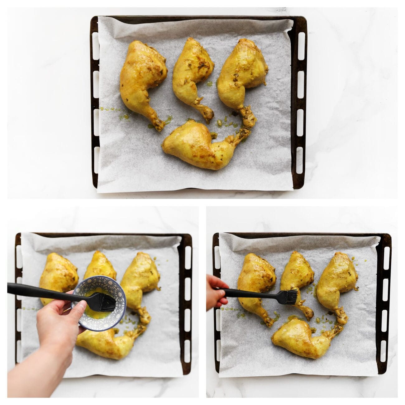 Draai de kip halverwege. Zo neemt hij aan alle kanten evenveel smaak op.