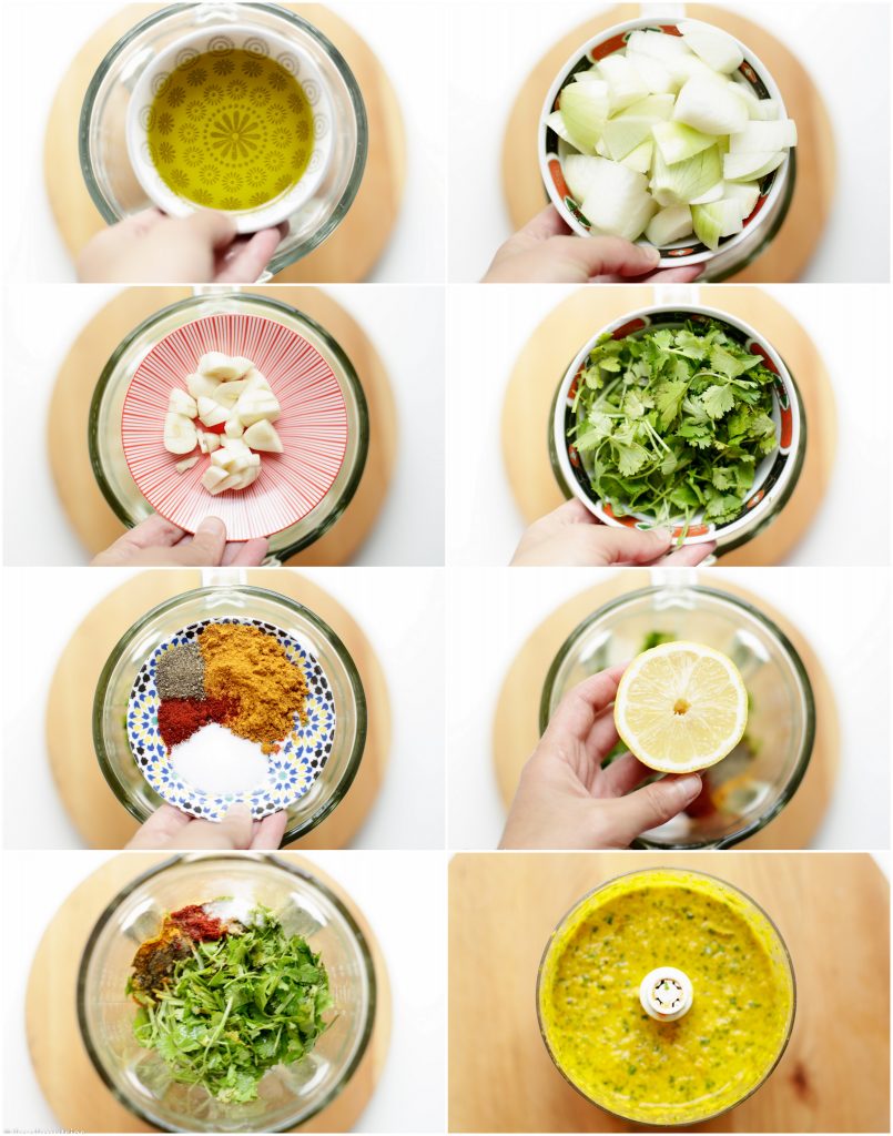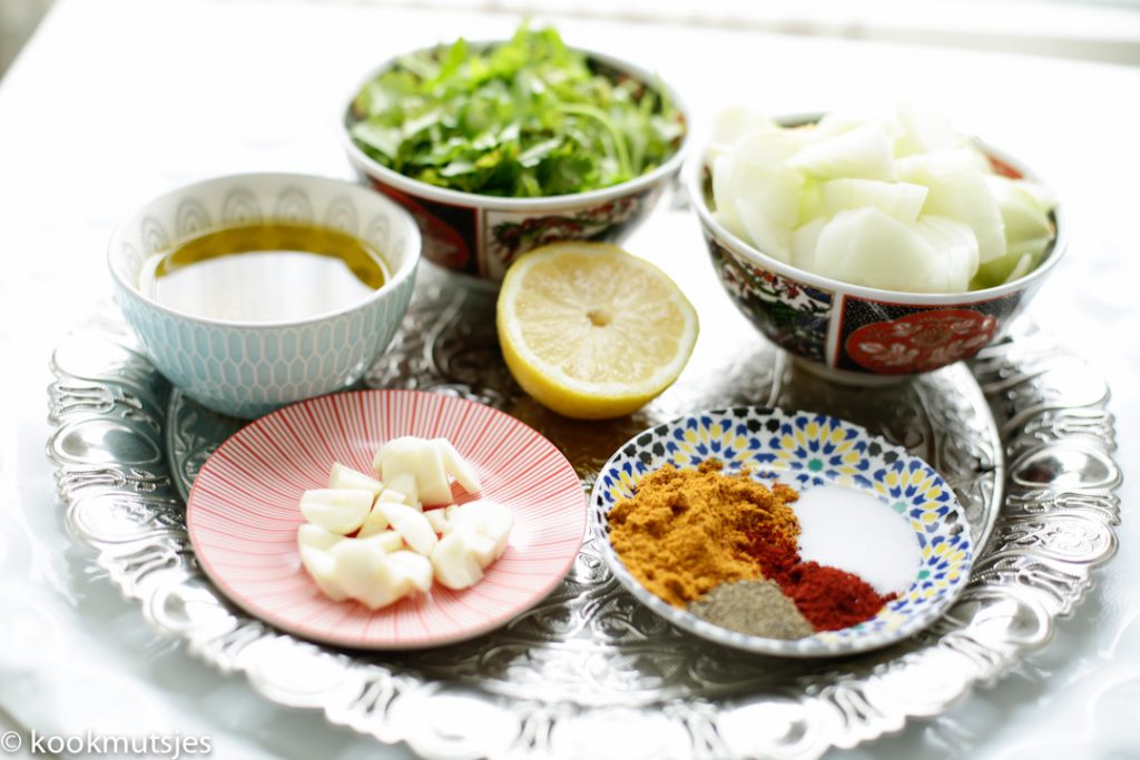 Doe de ui, knoflook, koriander, ras el hanout, paprikapoeder, gemberpoeder, zout, saffraan, zwarte peper, citroensap en olijfolie in een mixer en mix dit niet al te fijn.