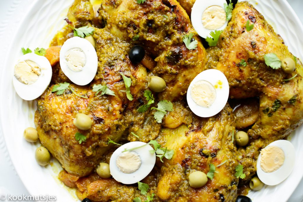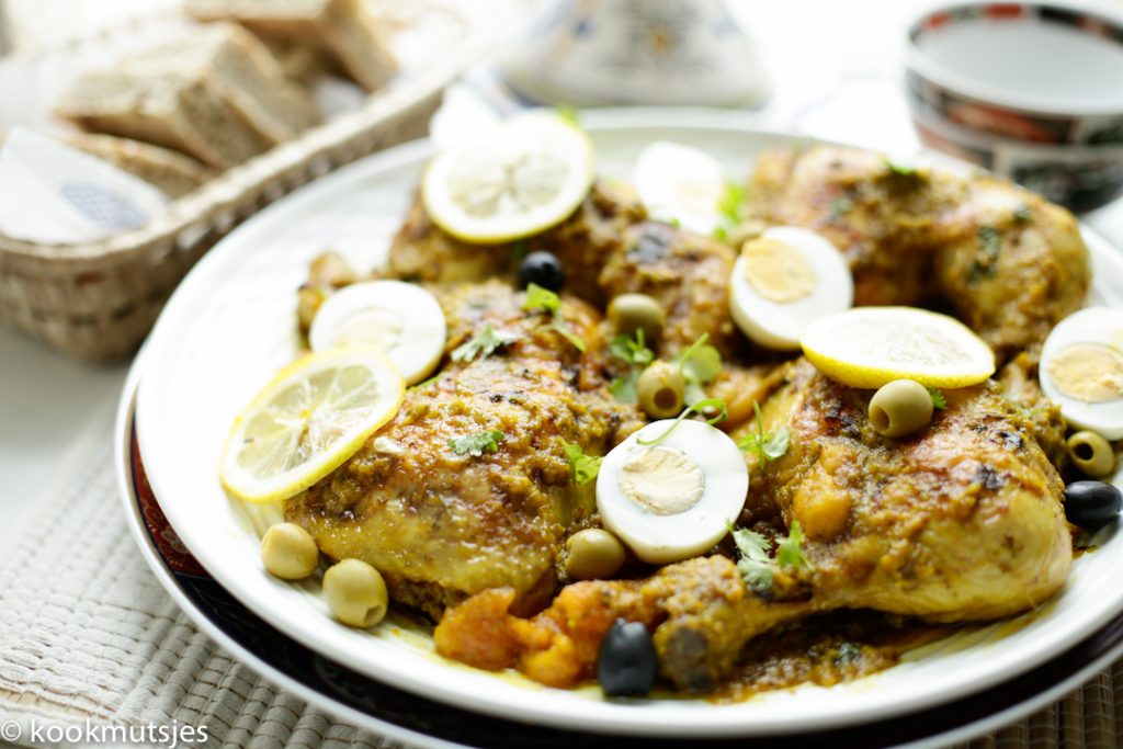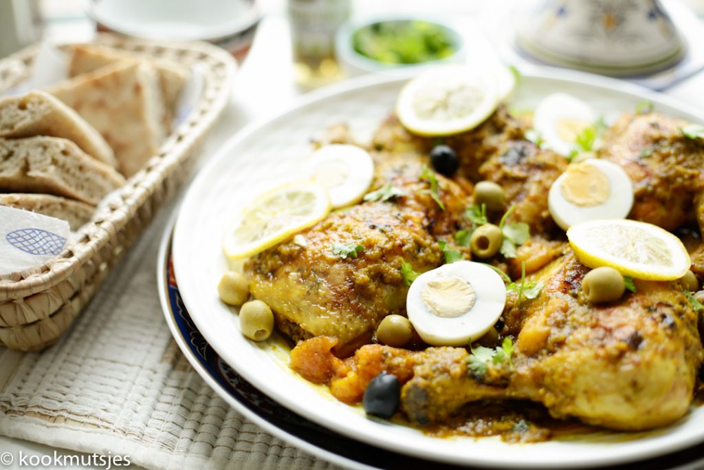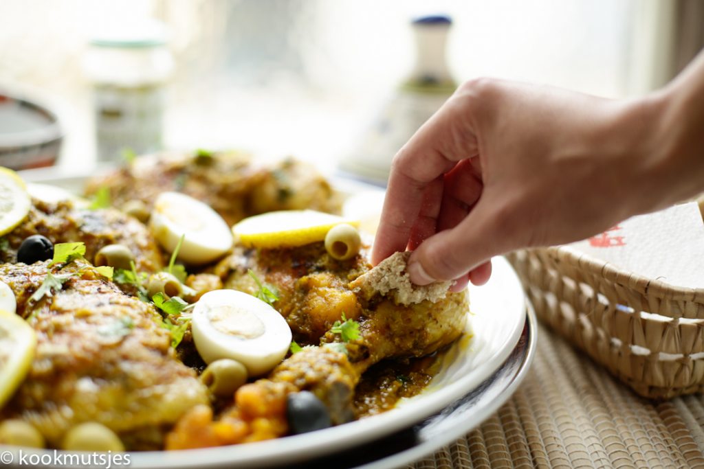 Traditionele Marokkaanse gerechten worden altijd rechtstreeks van de pot geserveerd op een grote gemeenschappelijke bord waar elk persoon aan zijn of haar eigen kant van het gerecht eet. Serveer de kip met olijven en top het gerecht af met heerlijke aardappelen/patat! Maak het gerecht af met lekkere Marokkaanse brood om de kippenbouten samen met de jus goed op te kunnen scheppen!