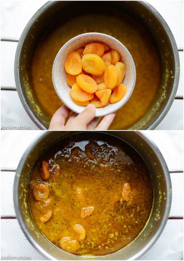 Saus gooi je niet weg maar laat je verder koken. Voeg wat gedroogde abrikozen toe.