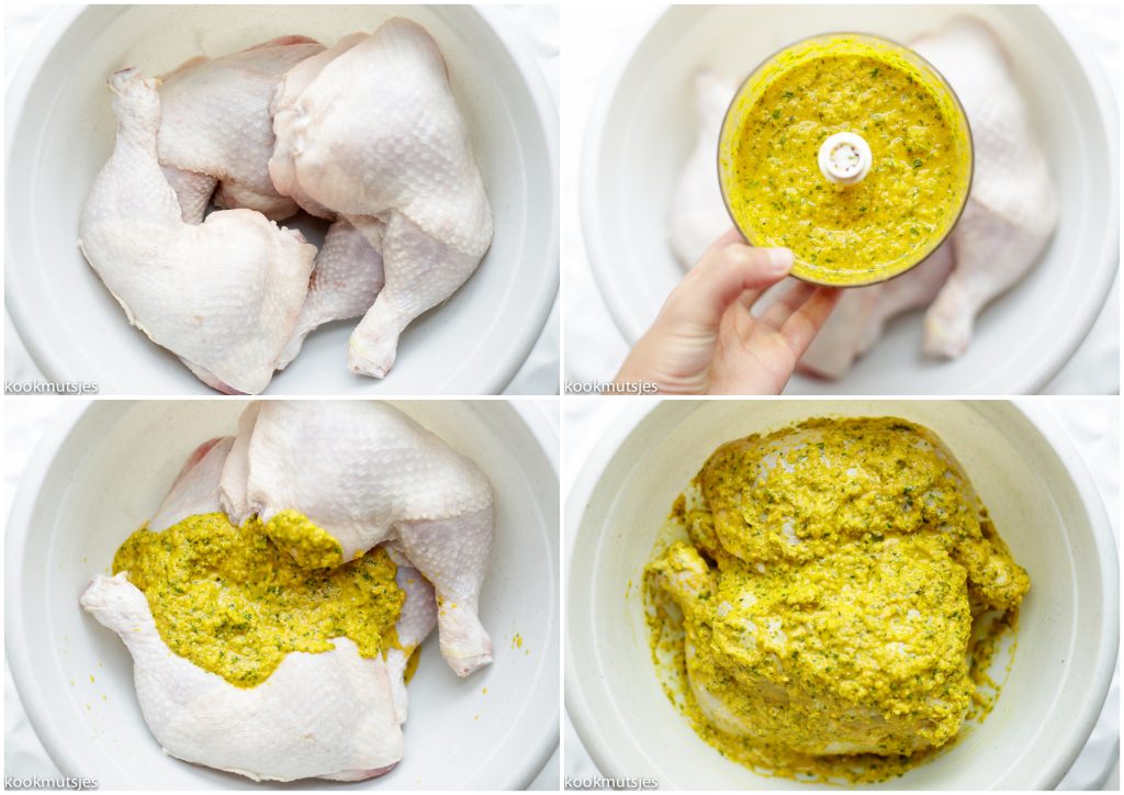 Smeer de kip goed in met de saus/marinade en laat het goed intrekken (liefst een hele nacht).