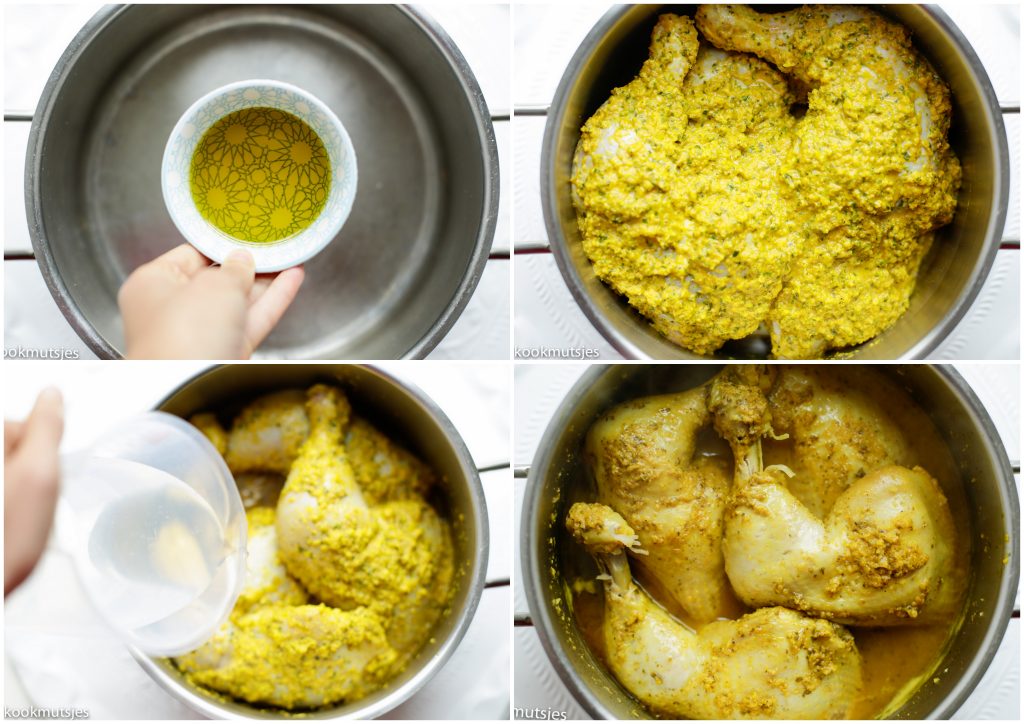 Doe de olie in een pan en voeg de kip en rest van de saus toe. Bak de kip voor zo’n 7 minuten. Voeg het water toe en laat het nu goed doorkoken op hoog vuur, als het borrelt zet je het vuur lager. Laat het nu verder koken voor zo’n 55 tot 60 minuten. Je kunt kijken of de kippenbout gaar is door er met een vork ik te prikken. Komt er niks vloeibaars uit, dan is het klaar.