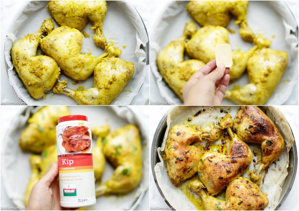 Haal nu alleen de kip eruit. Leg de kip op een bakpapier beklede ovenschaal en smeer er wat roomboter op. Maak het af met een beetje kipkruiden. Leg de gekookte kippenbouten in de oven voor zo’n 15 tot 20 minuten op 220 ℃ of totdat de kip goudbruin kleurt.