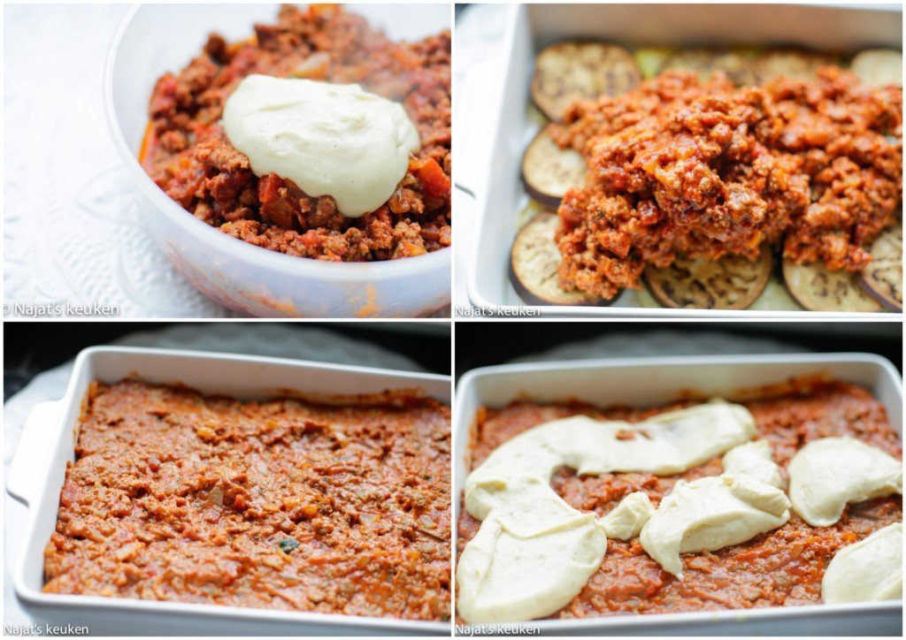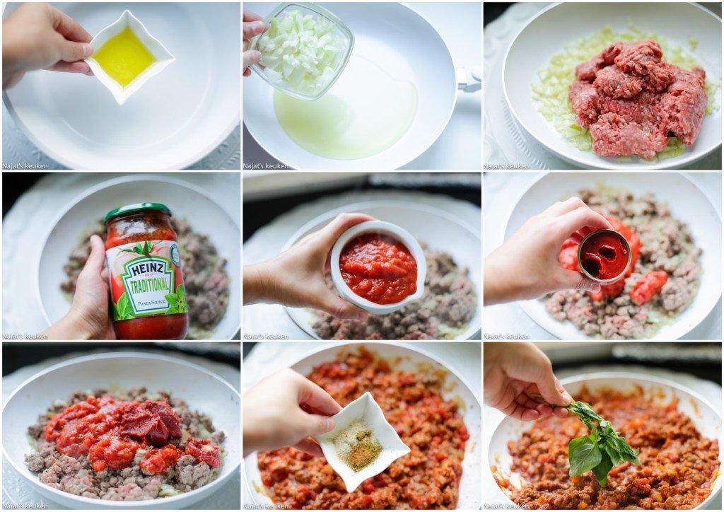 4 Verhit wat olijfolie in een steelpan en voeg de ui en knoflook toe, bak zo’n 5 minuten. Voeg het gehakt toe, rul voor zo’n 5 minuten. Voeg de tomatensaus, tomatenpuree, zout, zwarte peper, uienpoeder, komijn, kaneel en oregano toe. Kook zo’n 7 minuten samen. Haal van het van het vuur en leg het apart. |