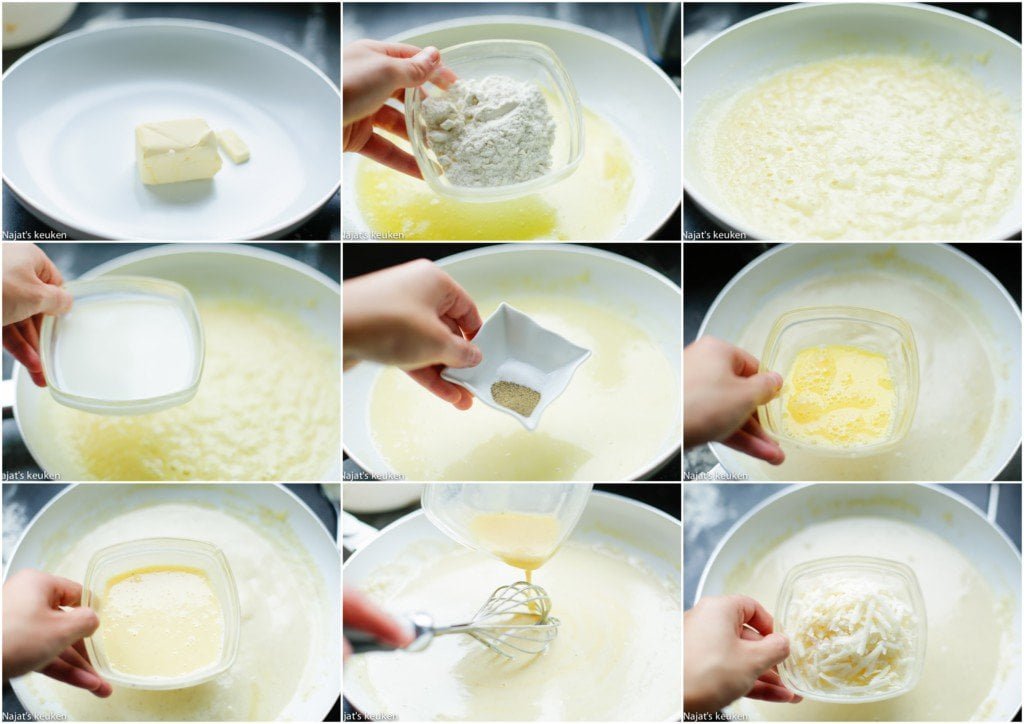 5 Smelt wat roomboter in een steelpan en voeg bloem toe, kook voor een minuut. Voeg de halfvolle melk een beetje bij beetje toe samen met zout en zwarte peper. Roer goed samen tot het dik aanvoelt. Kluts de eieren apart en voeg er wat van het roomboter mengsel toe (2 eetlepels), klop goed samen. Giet het geklutste ei steeds een beetje bij beetje toe aan het roomboter mengsel, kook samen en voeg de parmezaanse kaas toe. Roer tot een gladde massa en de kaas verdwenen is. Haal van het vuur. |