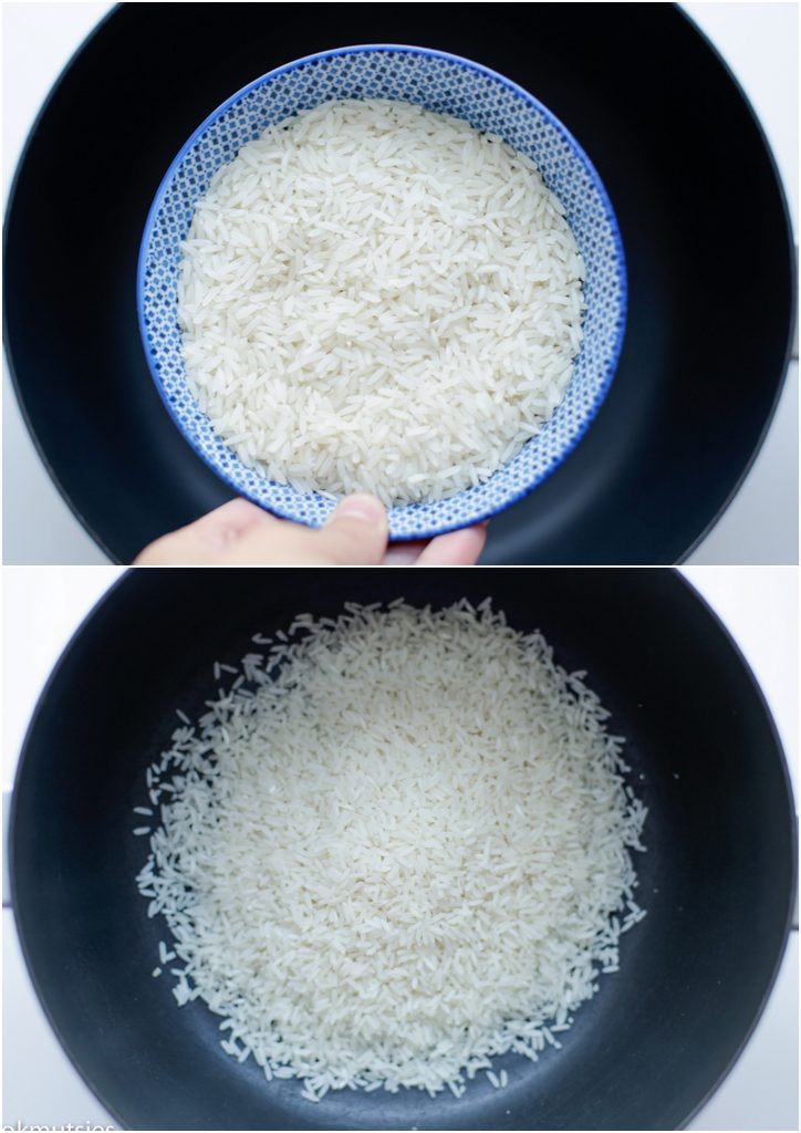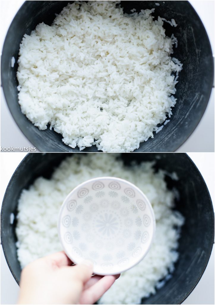 2 Kook de rijst eerst voor 5 minuten op hoog vuur of tot het begint te borrelen. Zet het dan op een middelhoog pitje en laat het doorkoken voor 5 minuten. Verplaats nu de pan op de kleinste pitje en zet het vuur op z’n laagst. Laat het zo’n 15 tot 20 minuten koken tot de rijst wat bovenop ligt volledig droog is. Voeg de rijstazijn toe en meng alles samen. Leg de deksel erop en laat het compleet afkoelen. |