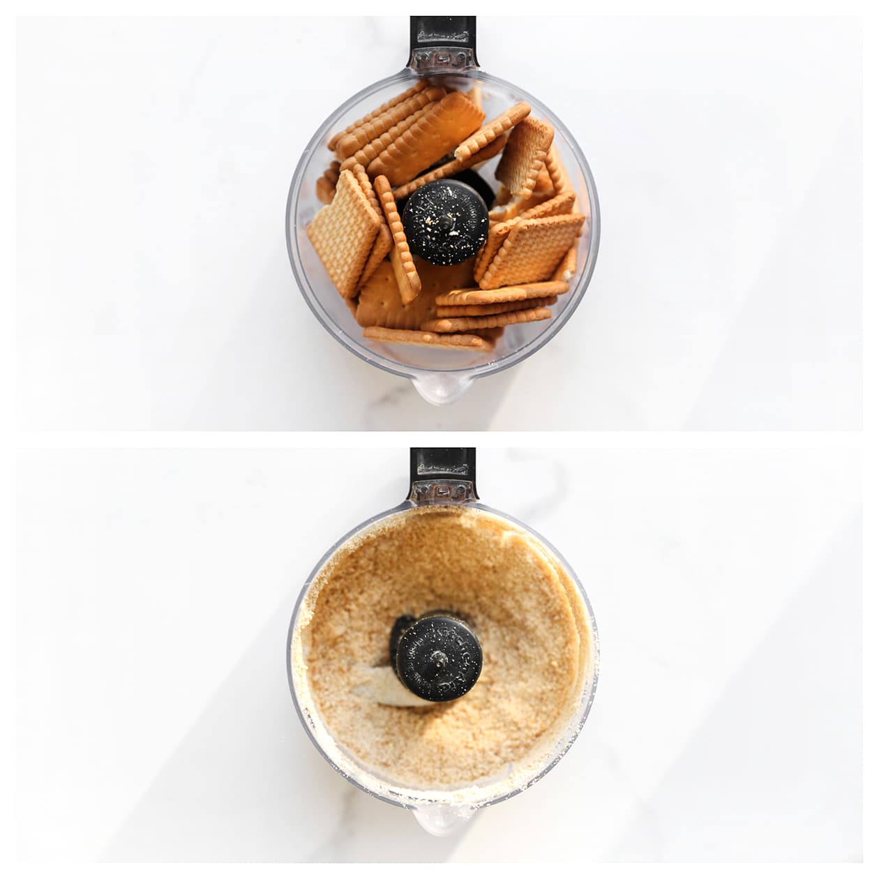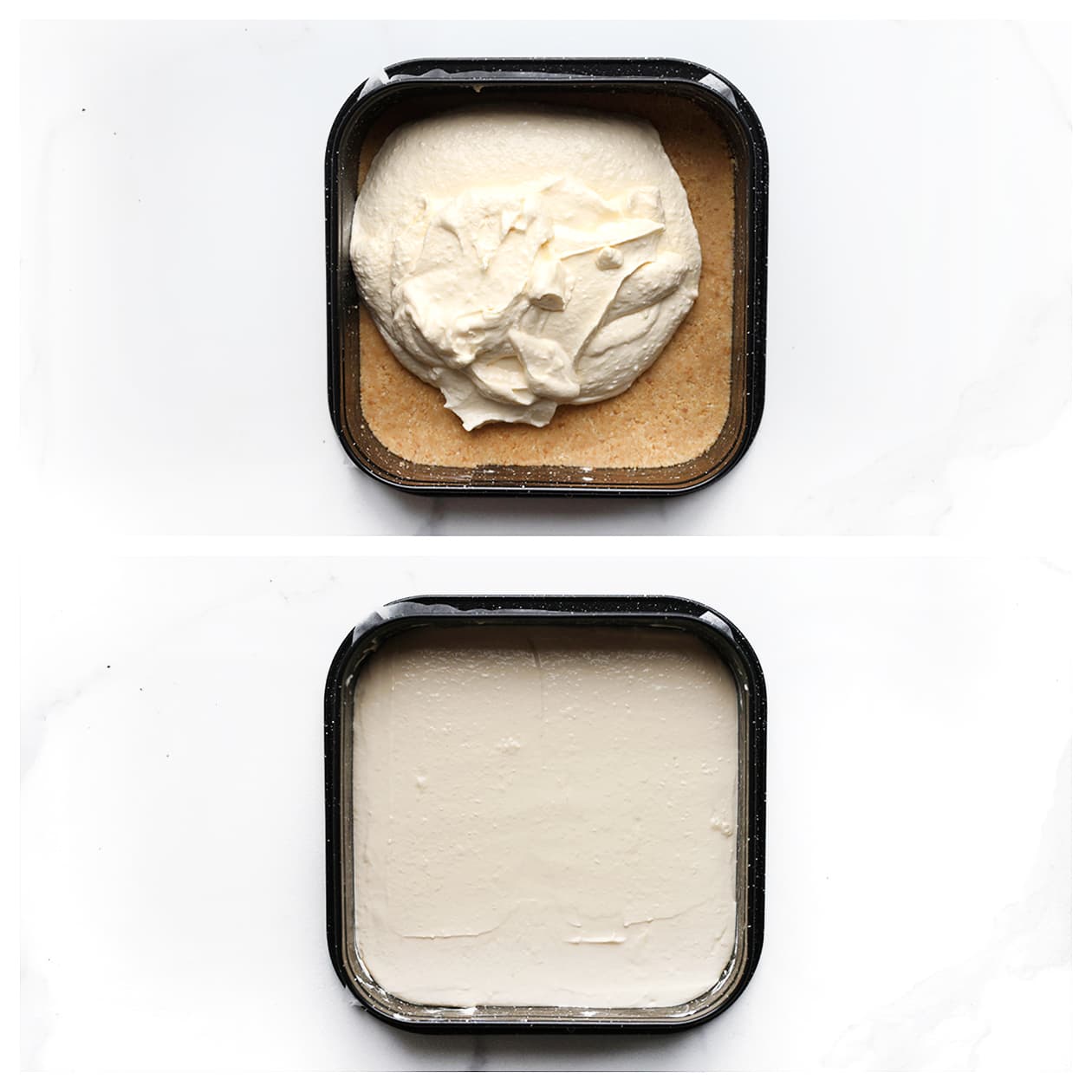 7 Zet de cheesecake in een voorverwarmde oven op 125 °C. Bak 60–65 minuten, of tot de randen stevig zijn en het midden nog licht wiebelt. Zet de oven uit en laat de cheesecake 1 uur in de oven staan om scheuren te voorkomen. Laat de cheesecake vervolgens volledig afkoelen en zet hem daarna in de koelkast, bij voorkeur een hele nacht, zodat hij goed kan opstijven. |
