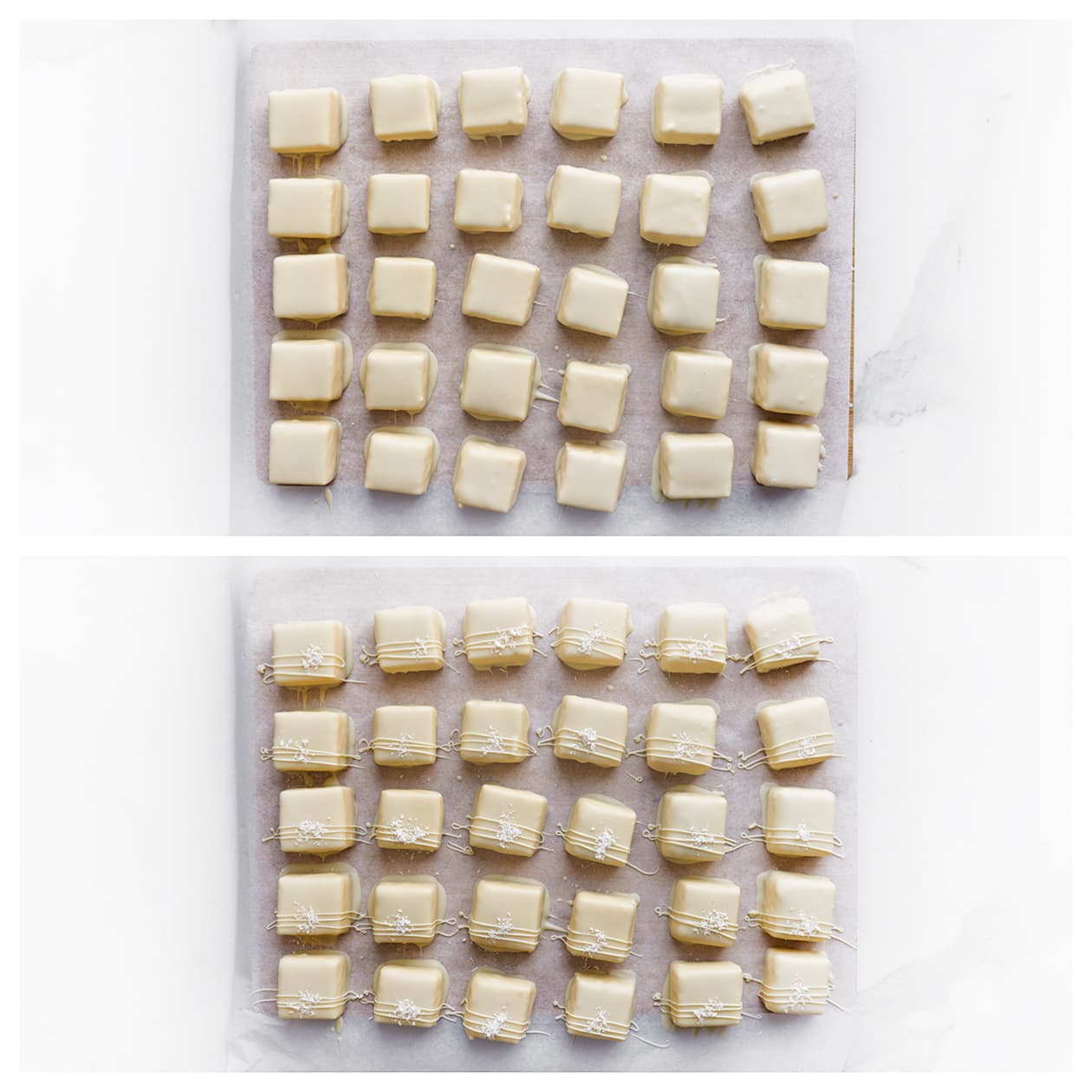 Is de chocolade te dik? Voeg ½-1 el zonnebloemolie toe. Leg de blokjes na het dippen meteen op bakpapier zodat ze niet vastplakken.