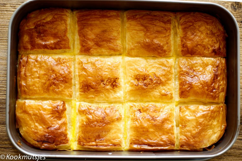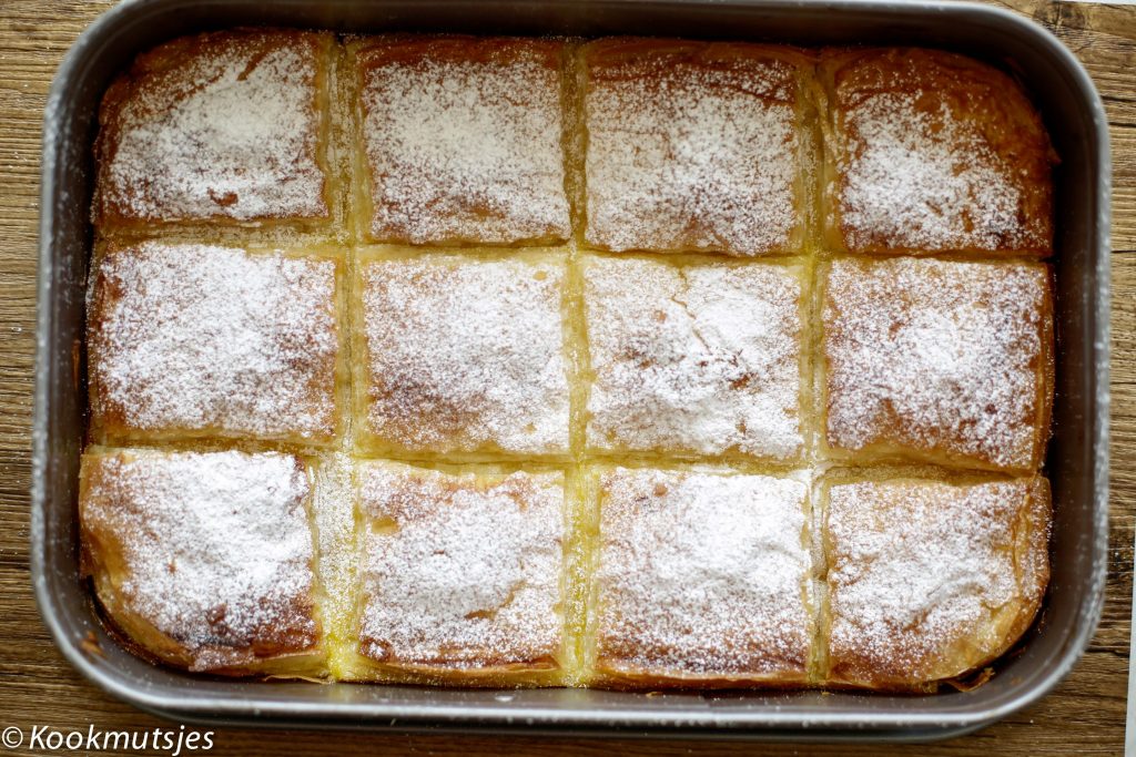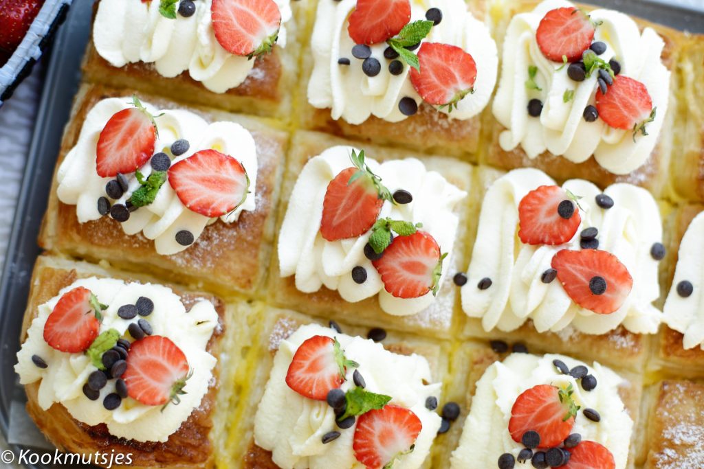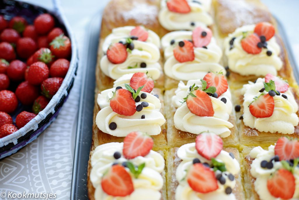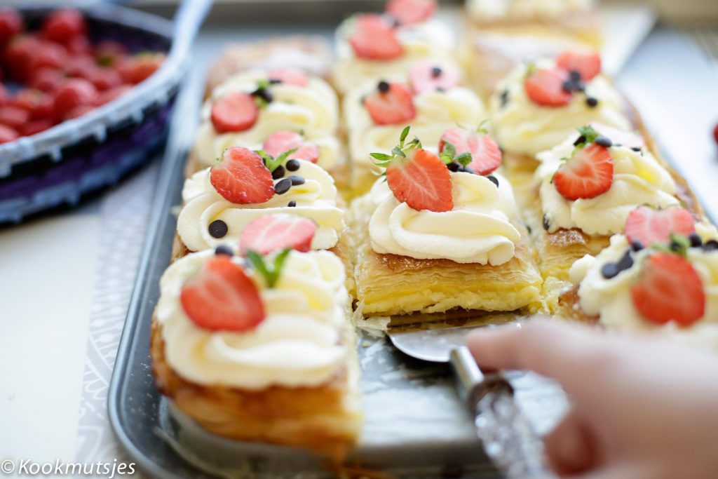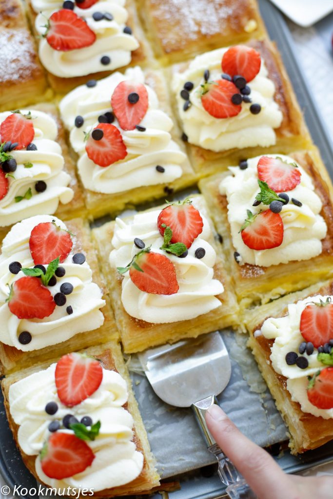 Wa’elikoem Selam Wafa, ik zou inderdaad 1 laag bladerdeeg doen, room erop en afmaken met nog een laag bladerdeeg. Houd er rekening mee dat bladerdeeg wel iets langer in de oven moet 😉