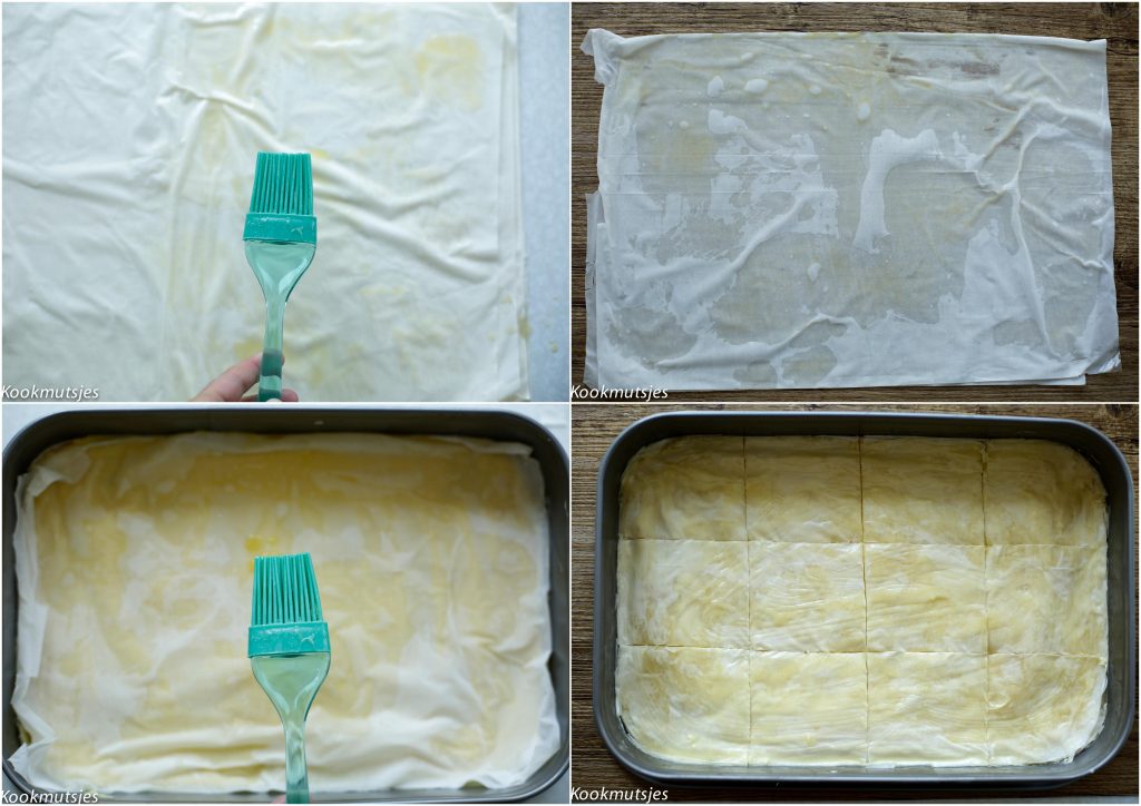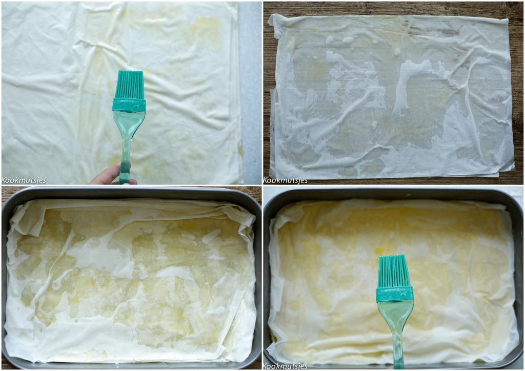 Ik heb een vraagje over stap 3 wat bedoel je met smeer de helft en vouw het dicht?? Dus moet ik 1 grote vel fillodeeg zo de helf besmeren en dan in de bakvorm en dan terug besmeren en dan terug een velletje fillodeeg terug de helft besmeren bedoel je zo?