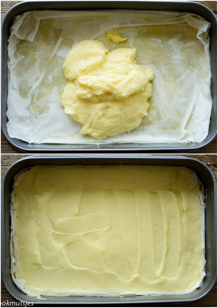 Dat snap ik maar dat is gelukkig niet het geval geweest, je moet het echt goed laten afkoelen. Ik gebruik hier een grote bakvorm waardoor de banketbakkersroom niet zo hoog is. Je kunt er een eitje door heen mixen indien gewenst, maar dat hoeft niet hoor. Heb dat namelijk ook niet gedaan (scheelt je weer een ei).