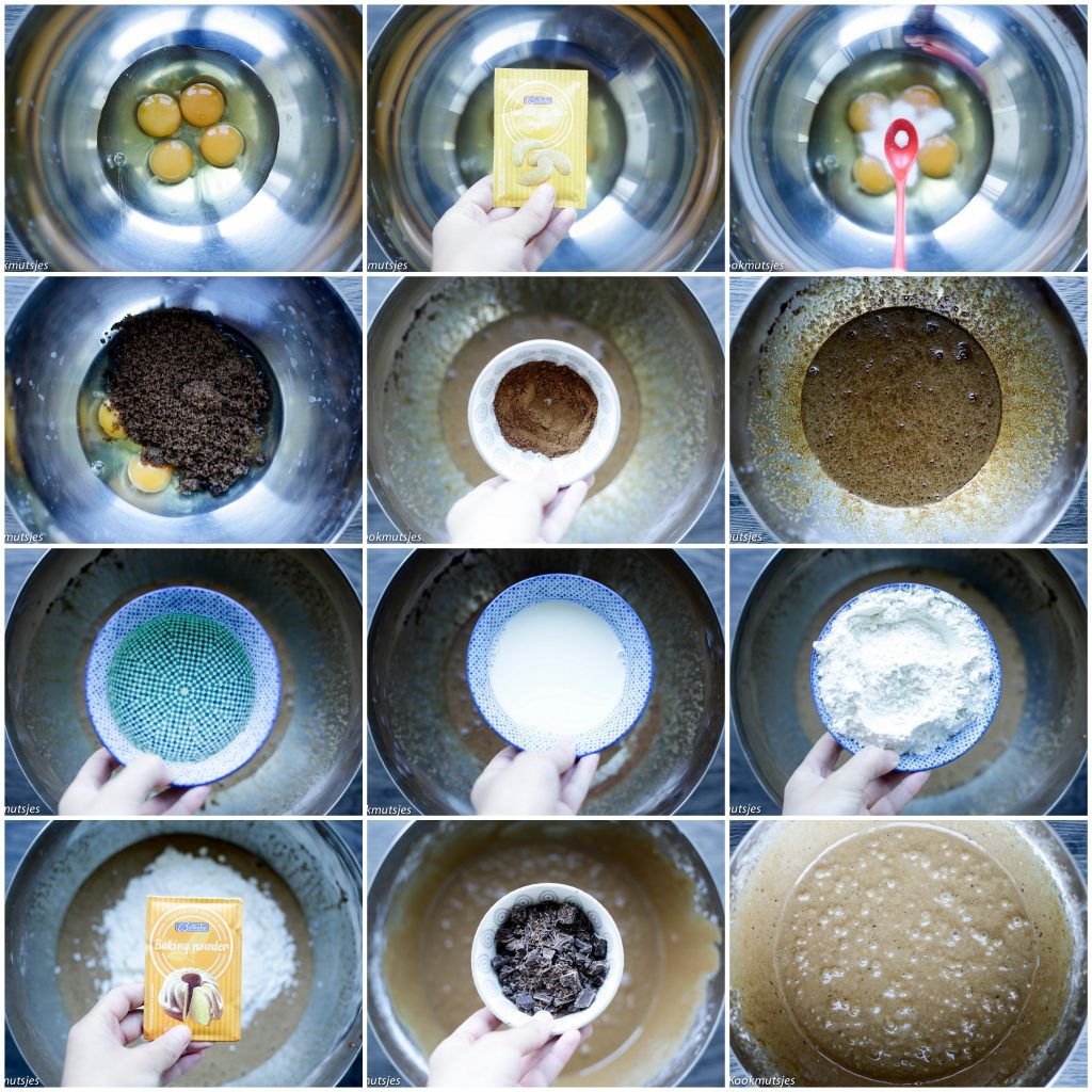 1 Hak de chocolade niet al te fijn. Klop de eieren samen op met de donkerbruine basterdsuiker, vanillesuiker, zout en speculaaskruiden voor een minuut. Voeg de zonnebloemolie, melk, bloem en bakpoeder toe en mix samen. Voeg de gehakte chocolade toe en mix alle ingrediënten samen tot een gladde massa. |